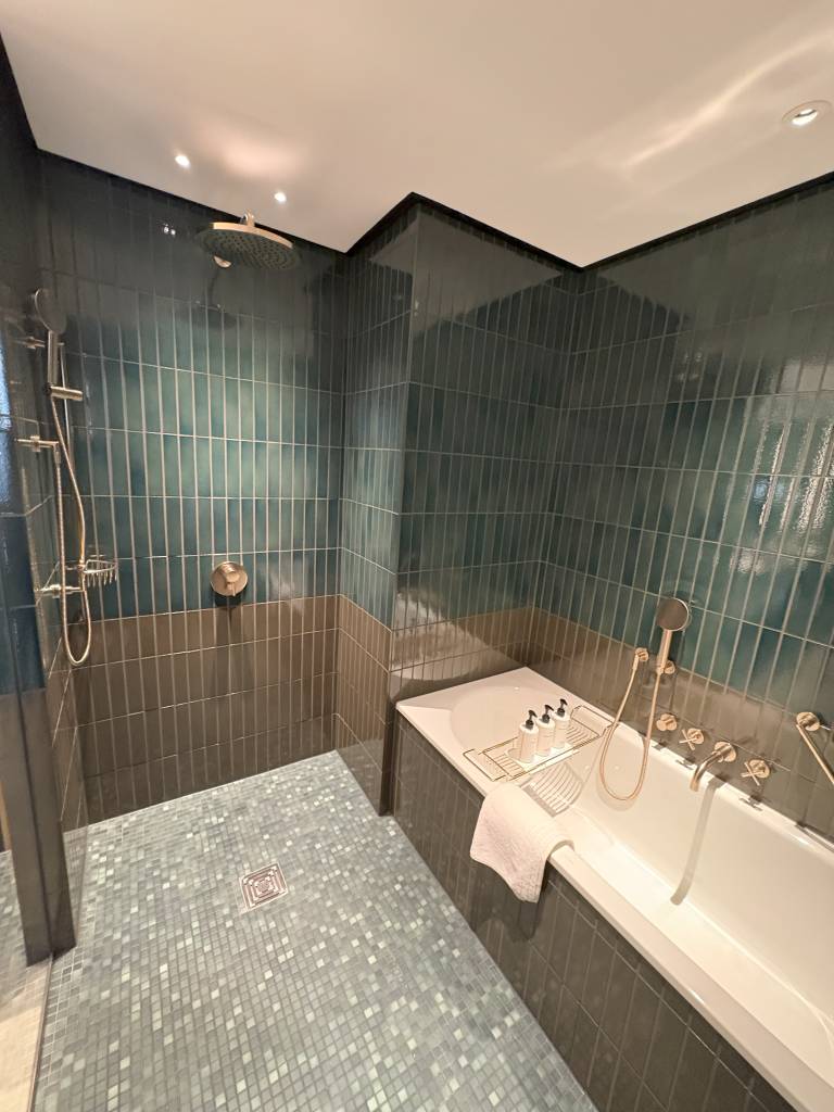 Das Badezimmer ist sowohl durch den begehbaren Kleiderschrank, in dem sich sowohl Bademäntel als auch Safe befanden, als auch über das Schlafzimmer erreichbar. Ein breiter Hocker ist der zentrale Akzent des Badezimmers, welches mit zwei Waschtischen, einer Badewanne, der eine Dusche vorgelagert ist, und einem separaten Raum für das WC ausgestattet ist.