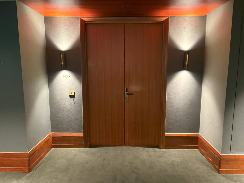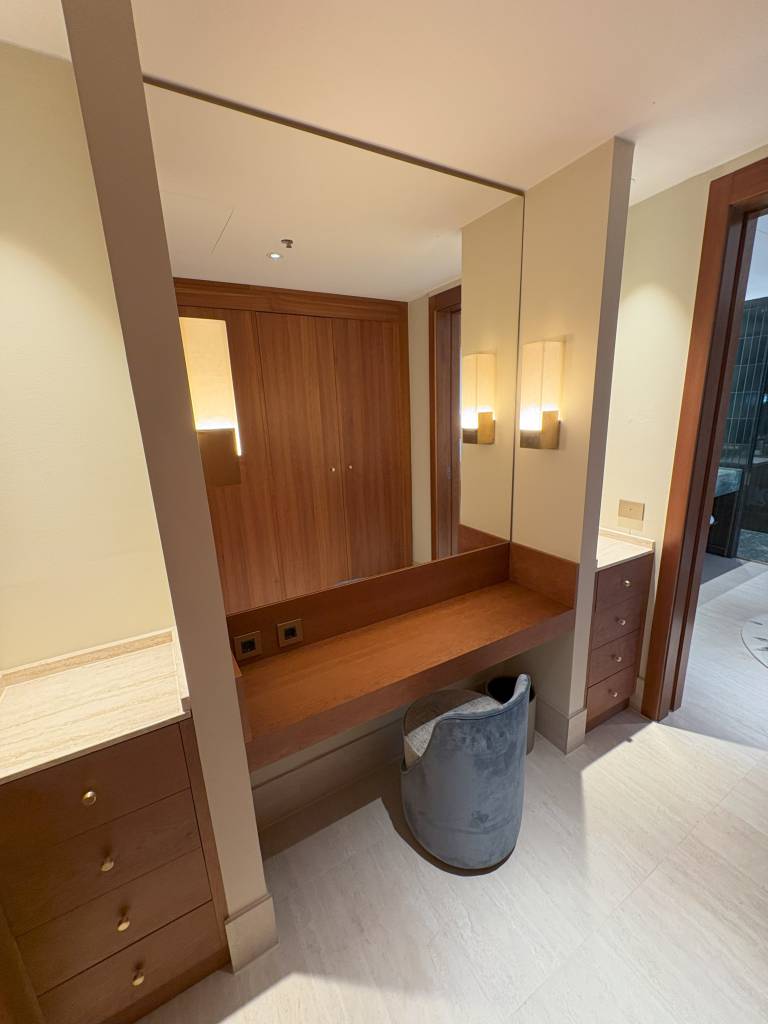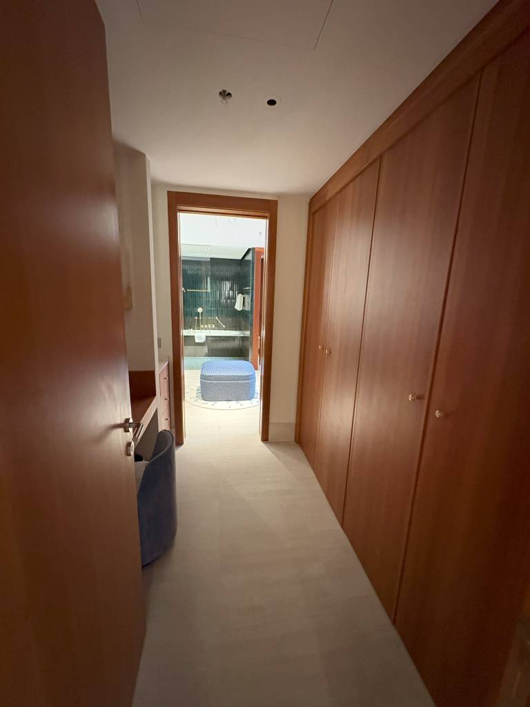 Ein Portal mit Doppeltüren ebnet den Weg in den Flur der King Executive One Bedroom Suite. Die Aufteilung ist an dieser Stelle bereits perfekt, wenn man Gäste in der Suite empfangen möchte, denn vor Kopf befindet sich der Wohnbereich. Die Tür rechts führt zum Gäste-WC mit dem Vorbereich samt Waschtisch und einiger Schubladen sowie dem WC in einer Nische. Direkt neben der Tür zum Gäste-WC dient ein Einbauschrank als Garderobe für Gäste. Noch fehlten dort die Kleiderbügel. Linker Hand verbindet der begehbare Kleiderschrank den Eingangsbereich mit dem Hauptbadezimmer.