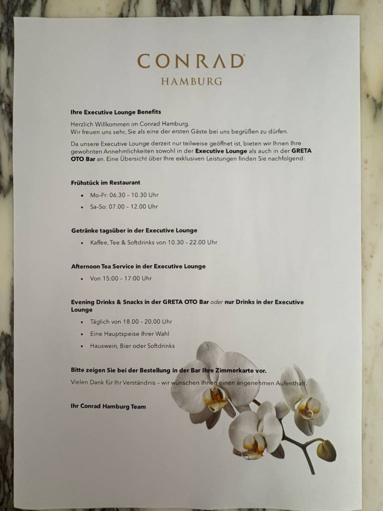 Während meines Aufenthalts im Conrad Hamburg begleitete mich mein Hilton Honors Diamond-Status. Die Vorteile, die ich üblicherweise im Hotel erhalte, sind folgende: