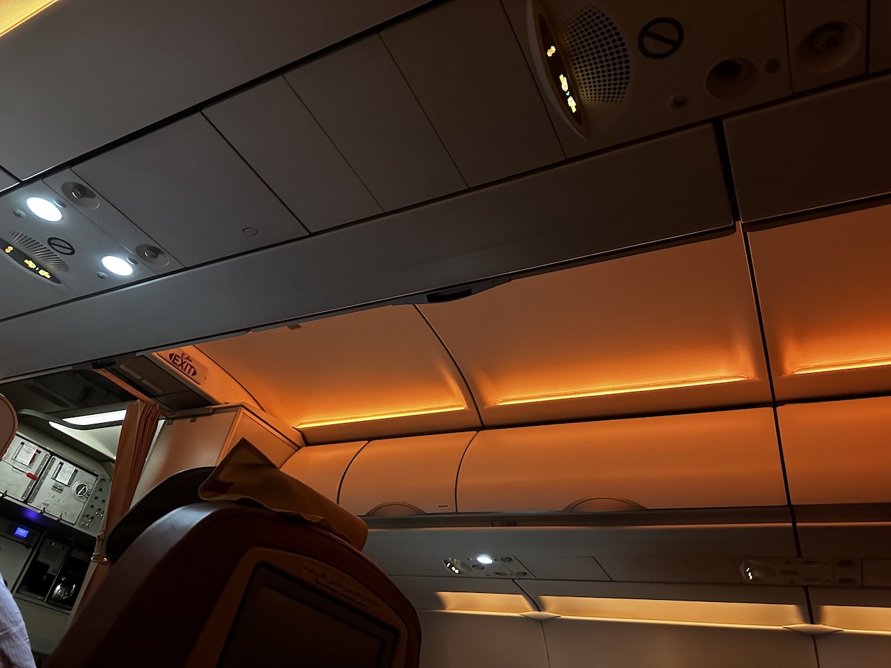 Die Business Class ist mit festen Trennwänden und einem Vorhang von der Economy Class abgetrennt. Der Airbus A320 war mit Moodlight ausgestattet.