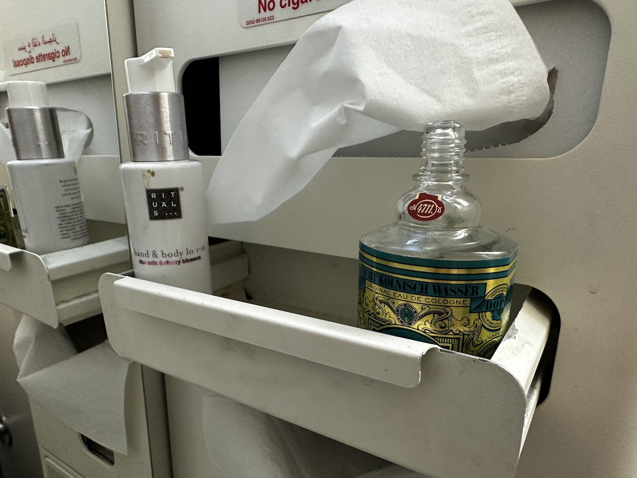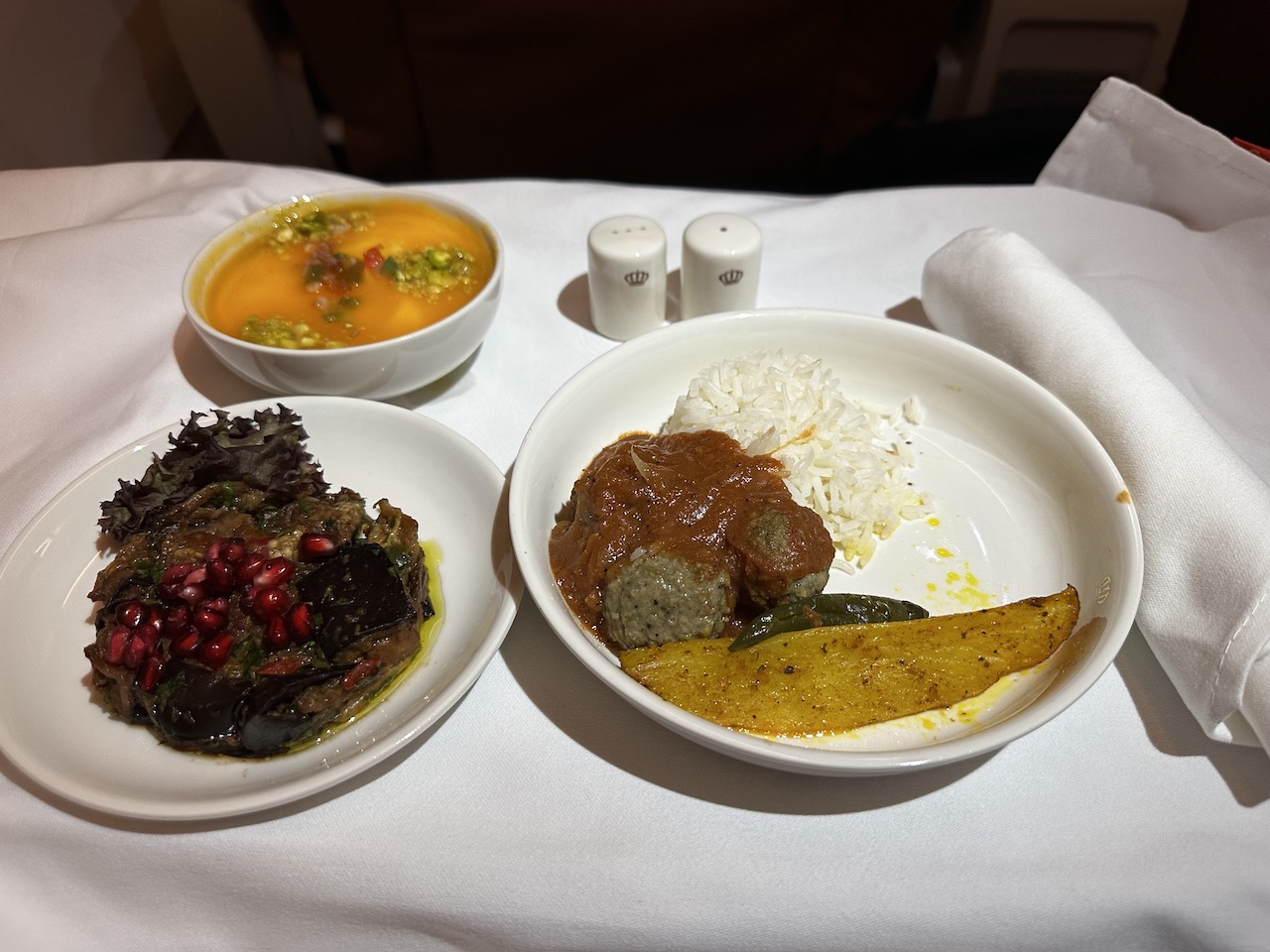 Die Flugbegleiterin hatte schon am Boden die Essenswünsche aufgenommen und die Gerichte entsprechend nach dem Start serviert. Wir hatten jeweils einmal westlich und einmal orientalisch bestellt und erhielten unterschiedliche Vorspeisen, Hauptgänge und Desserts.