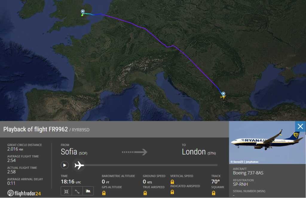 Am Montagabend stand der letzte Flug des Tages für die Boeing 737-800 mit der Registrierung SP-RNH auf dem Plan. Das von der Ryanair-Tochter Buzz betriebene Flugzeug sollte zurück von der bulgarischen Hauptstadt Sofia (SOF) zu ihrer Basis am Flughafen Stansted (STN) fliegen. Mit dabei waren 174 Menschen an Bord, als die Maschine um 21:30 Uhr am internationalen Flughafen von Sofia startete.