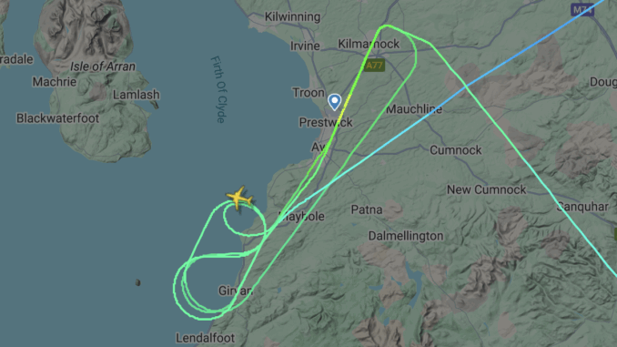 Bereits der erste Anflug auf Prestwick scheiterte: Böen von bis zu 150 km/h und Starkregen machten eine sichere Landung unmöglich. Die Piloten der Ryanair-Tochtergesellschaft Malta Air entschieden sich zunächst für ein Warteschleifen-Manöver, um auf eine Wetterbesserung zu warten. Nach 30 Minuten folgte ein zweiter Versuch, dieser misslang ebenfalls.