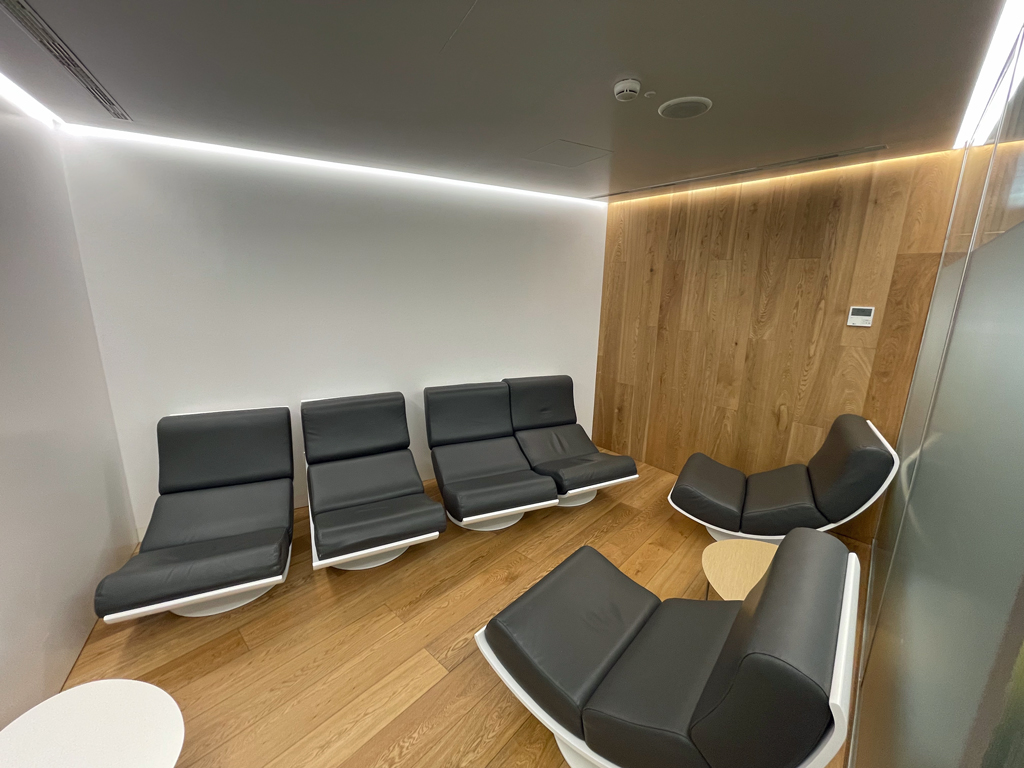 Ganz hinten befindet sich dann eine weitere Bar. Davor gibt es vom Eingang kommend auf der rechten Seite noch ein Aquarium-Konferenzraum und noch einen Bereich mit Sesseln. Dort gibt es bei den Sesseln weniger Tische, dafür aber mehr Steckdosen. Ebenfalls ganz hinten in der Lounge befindet sich noch ein kleiner Ruheraum mit ein paar Liegesesseln.