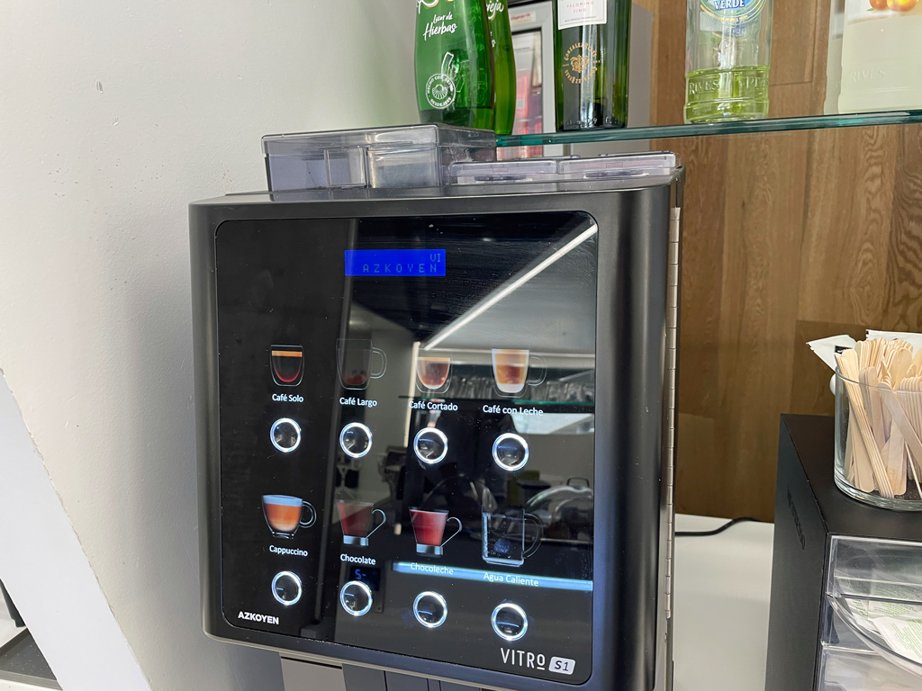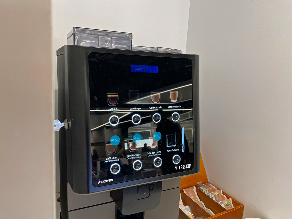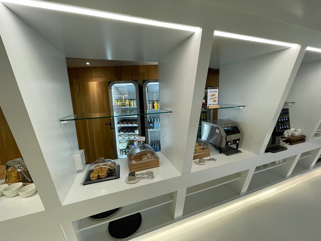 Von der Rezeption kommend findet man am Buffet zunächst viel Gebäck (Kekse, Muffins, Donuts und Brötchen). In einem Toaster kann man die Brötchen dann erhitzen. Heißgetränke kann man dann an einem der beiden Vollautomaten ziehen – hier lohnt sich, beide auszuchecken, denn sie bieten jeweils unterschiedliche Getränke an.