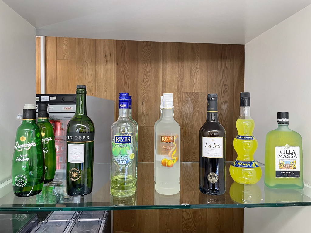 Spirituosen, Wein und Cava befineden sich an der hinteren Bar in der Lounge. Die Auswahl bei der Spirituosen besteht dabei im Wesentlichen aus internationalen Standardgetränken.