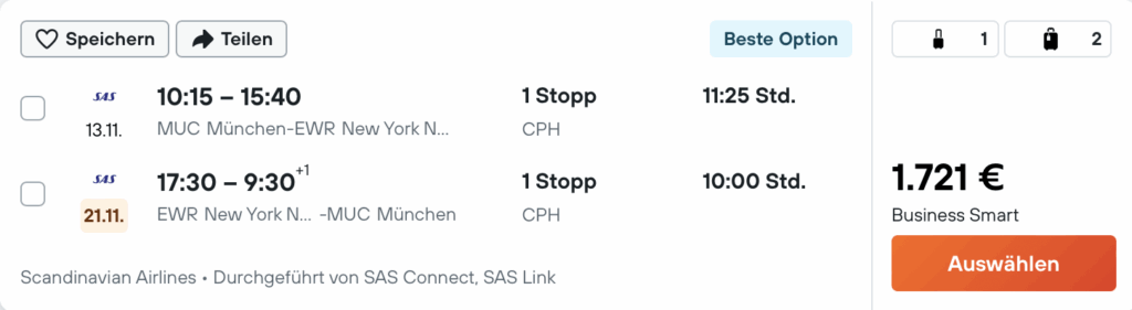 Verfügbar sind diese sehr guten SAS Business Class Angebote von Deutschland nach New York recht breit gefächert zwischen Oktober  2025 und April 2026, sodass es nicht all zu schwer ist hier einen passenden Termin zu finden, wenn man in dieser Zeit nach New York reisen will.