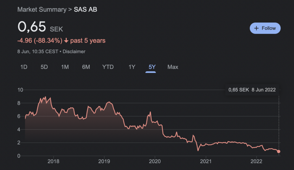 Die SAS Aktie ist im Zuge der Pandemie um fast 90 Prozent gefallen und mit gerade einmal 0,65 SEK (knapp 0,06 Euro), ist man inzwischen ein echter Penny Stock und an den Finanzmärkten hat SAS inzwischen ramsch Status erreicht. Analysten sehen hier einen weiteren Verfall der Aktie und teils auch den Exodus von SAS.