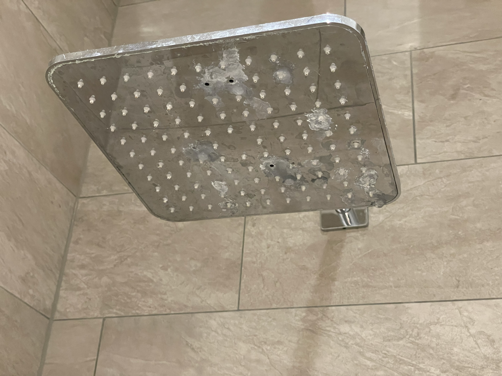 Auch nicht besser sah der Regenduschkopf aus. Dieser war verkalkt und vor allem fehlten schon Teile der Brausen, womit er per Definition defekt ist und ausgetauscht gehört.