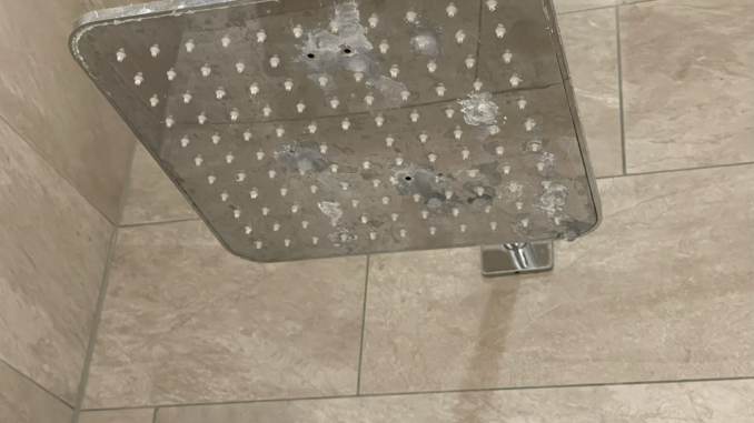 Auch nicht besser sah der Regenduschkopf aus. Dieser war verkalkt und vor allem fehlten schon Teile der Brausen, womit er per Definition defekt ist und ausgetauscht gehört.