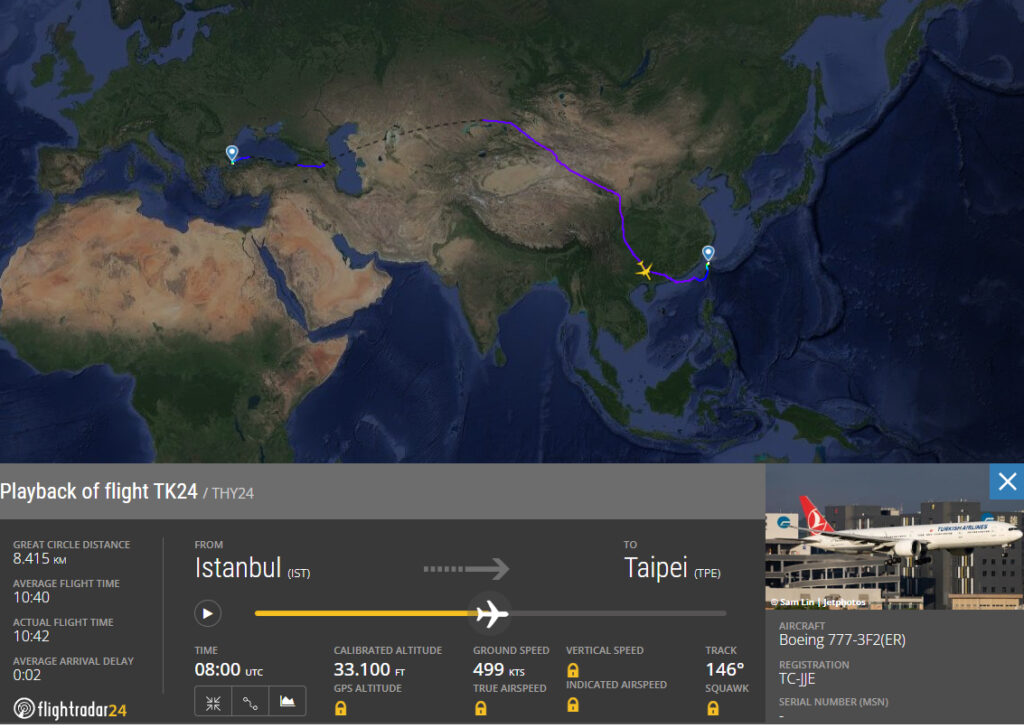 Eigentlich hätte Turkish Airlines Flug TK24 ein entspanntes Erlebnis werden können. Die Boeing 777-300 mit der Registrierung TC-JJE war am Donnerstag, den 5. September 2024, mit nur 214 Passagieren unterwegs. Je nach Konfiguration fliegt die 777 auch mit 349 oder sogar 400 Passagieren von Istanbul nach Taipei.