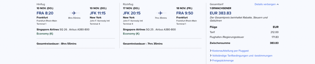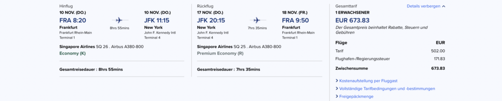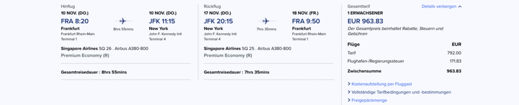 Daneben gibt es auch noch weitere sehr gute Angebote in der Premium Economy Class von Singapore Airlines, welche sich mit der Economy Class kombinieren lassen. So kann man den Hin- und Rückflug in der Singapore Airlines Premium Economy Class zwischen Frankfurt und New York ab 963 Euro buchen oder den Klassenmix (eine Richtung Economy Class und eine Richtung Premium Economy Class) ab 673 Euro buchen.