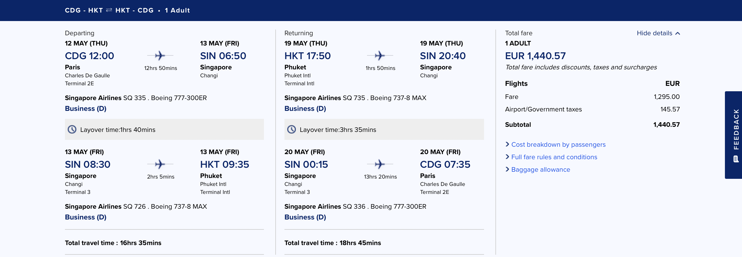 Singapore Airlines Business Class Angebote | Tarifdetails