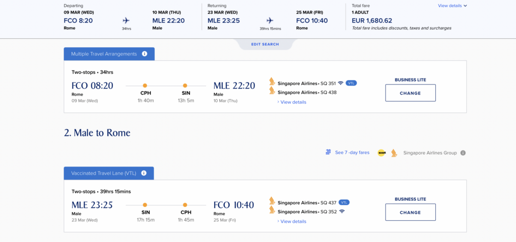 Jetzt gibt es aber sehr exklusive Singapore Airlines Business Class Angebote ab Italien, mit welchen man überraschend günstig und extrem komfortabel auf die Malediven fliegen kann. Auch wenn die Reise über Singapur einen deutlichen Umweg darstellt, ist die Singapore Airlines Business Class sicherlich eine der angenehmsten Optionen.