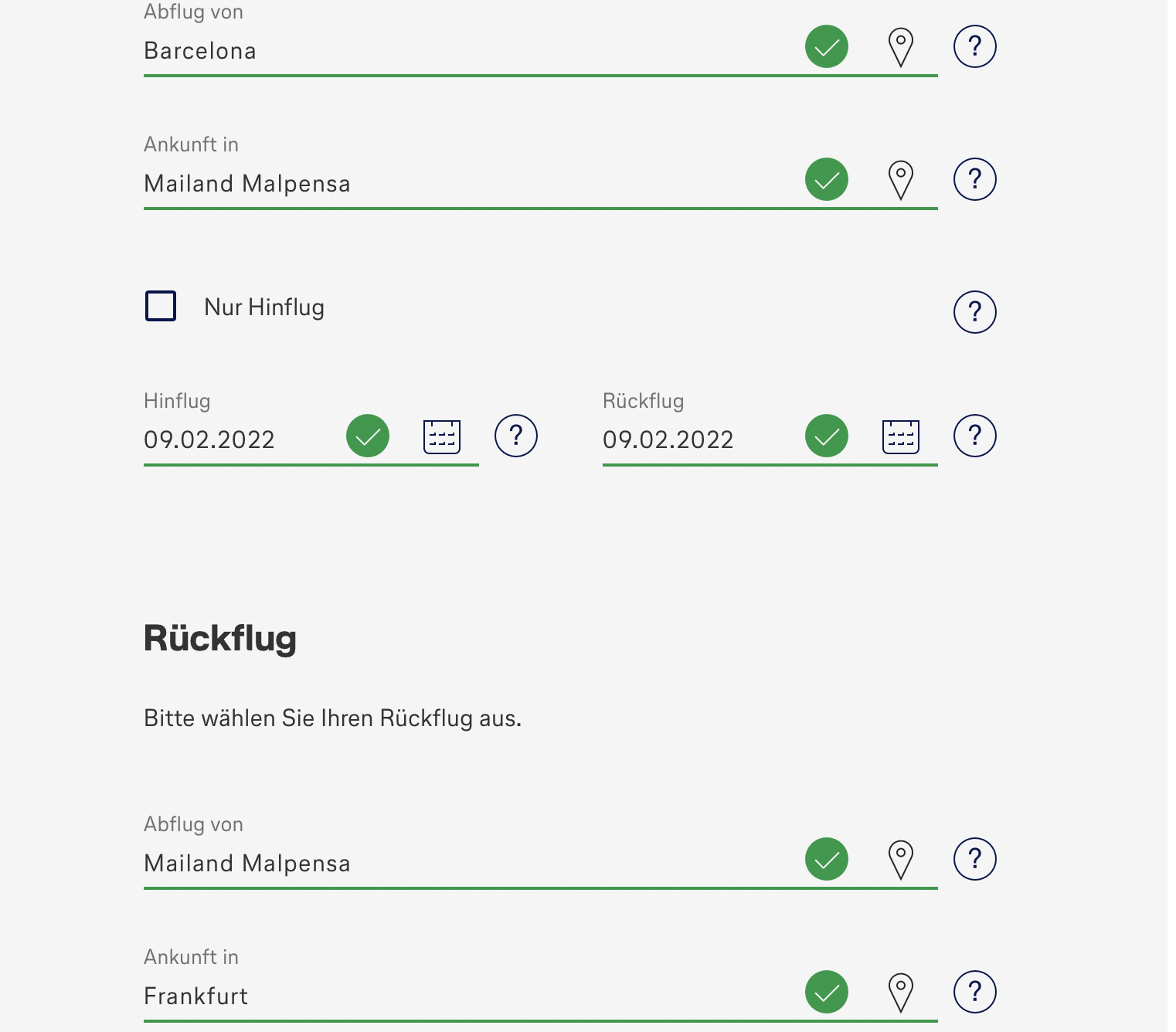 Hier müsst Ihr als Datum für den Hin- und Rückflug den selben Tag eingeben und Flüge von Barcelona nach Mailand und von Mailand nach Frankfurt, München, Zürich, Brüssel oder Wien suchen.