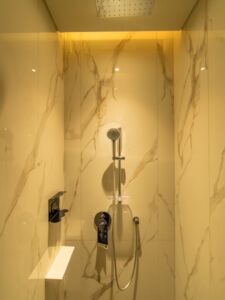 Wie es sich für eine First Class Lounge gehört, gerade an einem Langstrecken Drehkreuz wie Singapur, gibt es in der Singapore Airlines SilverKris First Class Lounge auch eigene Duschen in denen man sich frisch machen kann. Dabei teilt man die Duschen mit dem Private Room.