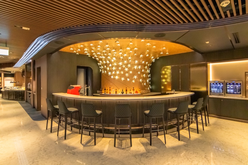 Ein besonderes Highlight der First Class Lounge ist die bediente Bar, an welcher man z.B. bei einem Singapore Sling auf seinem Abflug warten kann. Besonders die Installation mit Kristallen macht hierbei wirklich sehr viel her.