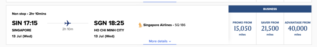 Um zu buchen, wählt einfach den gewünschten Flug auf der Singapore Airlines Seite aus. Hier werden Euch die normalen Saver Level Preise angezeigt, allerdings wird der Meilenpreis automatisch um 30% reduziert.