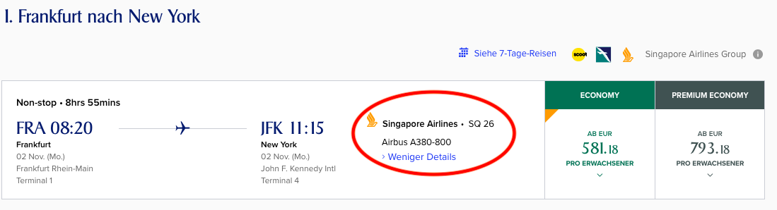 Vermutlich wird man mit einem Airbus A350 fliegen, welcher aktuell auf allen Langstecken von Singapore Airlines eingesetzt wird. Hierzu passt auch, dass man nur Business Class, Premium Economy und Economy Class Tickets auf den Flügen zwischen Frankfurt und New York verkauft. Die Airbus A380 würden über eine Suite Class verfügen.