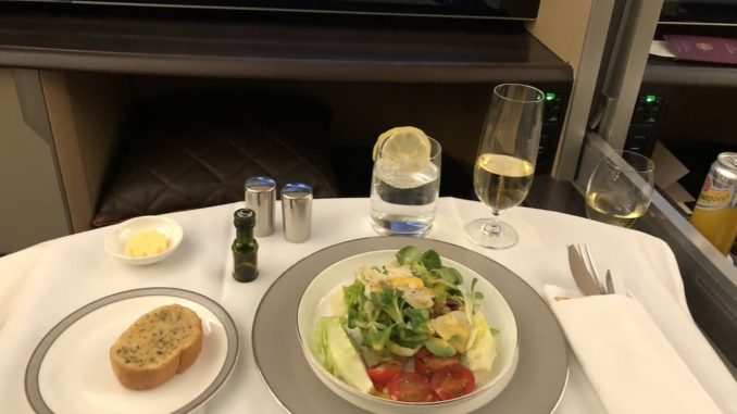 Aber auch in der First- und Business Class werden Vorspeise, Hauptgericht und Dessert in einem Gang serviert. Diesen kann man sich in etwa so vorstellen, wie den Service, den Singapore Airlines in der Business Class auf Flügen von 2-4 Stunden angeboten hat.