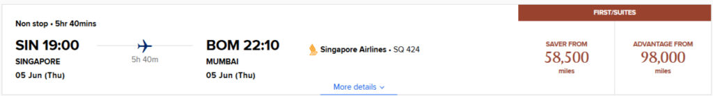 Für unseren Wunschtermin am 31. Mai und die Wunschverbindung von Singapore (SIN) nach Mumbai (BOM) sah die Auslastung der First Class noch gut aus, und es gab zumindest einen Standard Advantage Award. Der hätte so 98.000 KrisFlyer Meilen beansprucht und lag außerhalb des vorhandenen Budgets.