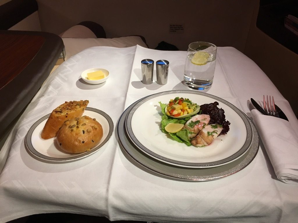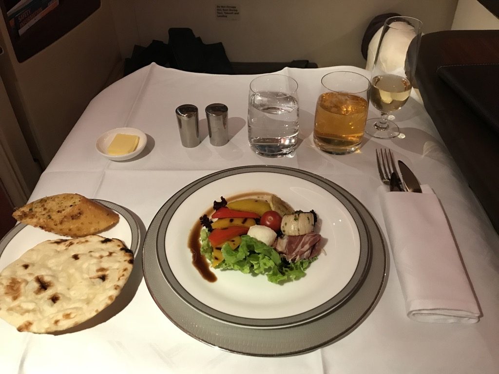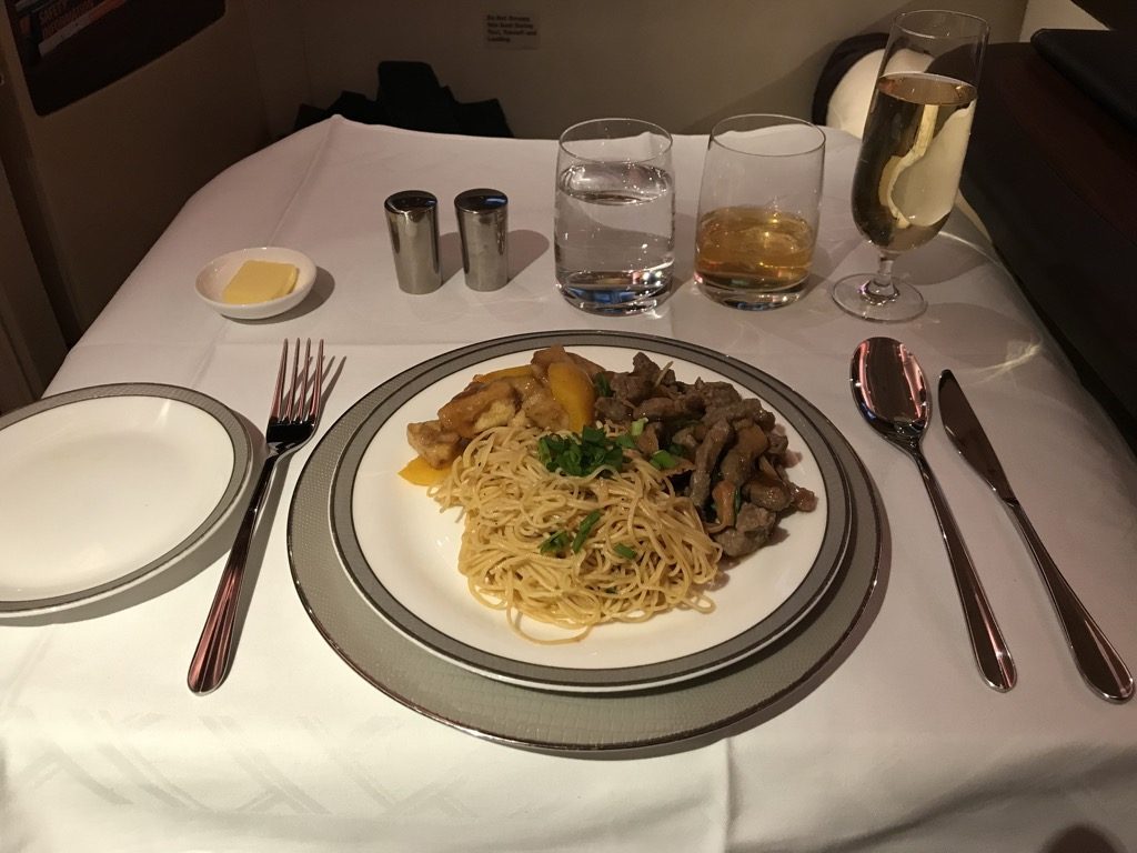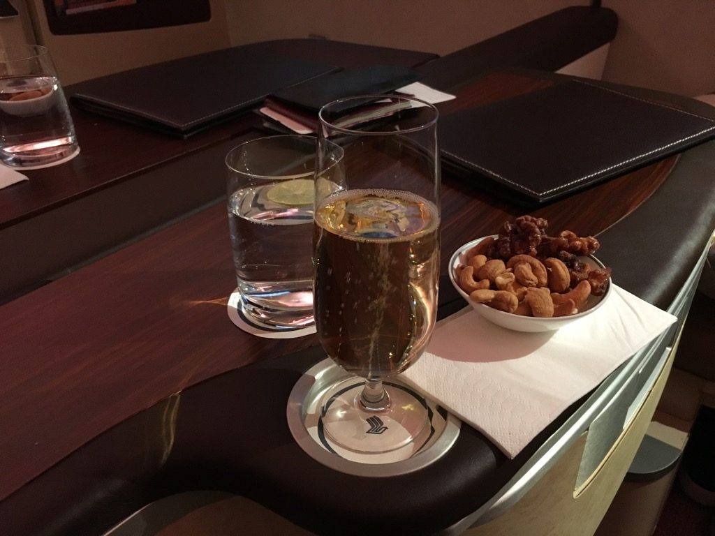 Auf diesem kurzen Nachtflug bot Singapore Airlines in der Suite Class ein vollständiges Abendessen an, allerdings handelte es sich hierbei um ein „Supper“, was bedeutet, dass es etwas abgespeckt ist. So gab es z.B. keinen Kaviar auf diesem Flug.