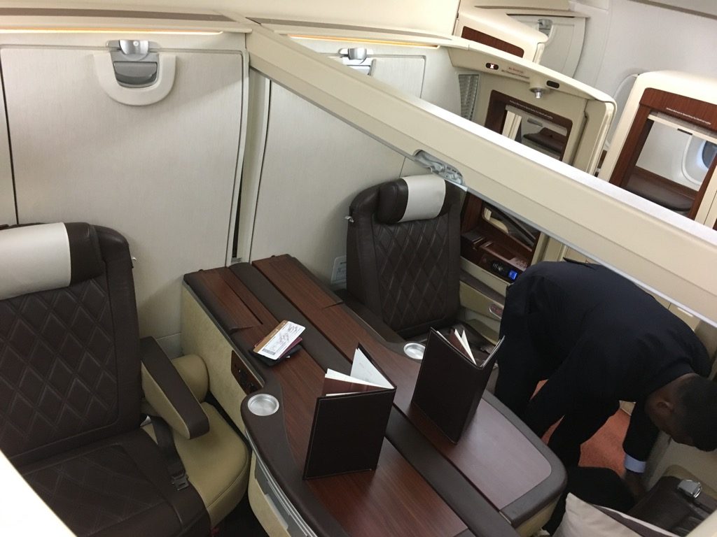 Direkt an der Tür wurden wir von zwei Flugbegleitern begrüßt und zu unserem Platz eskortiert. Was mich hierbei erstaunt hat war, dass man ohne einen Blick auf die Bordkarten zu werfen uns direkt mit Namen angesprochen hat. Zwar waren wir das einzige Paar und nur vier Passagiere waren in der Suite Class gebucht, dennoch fand ich dies sehr beeindruckend.