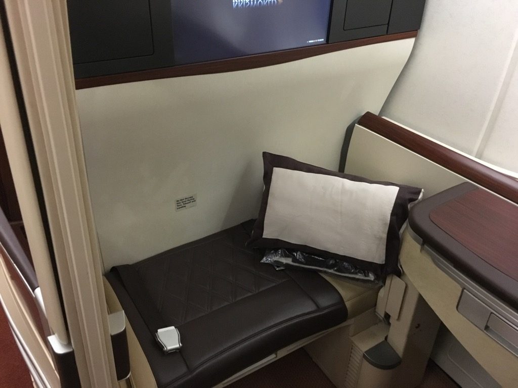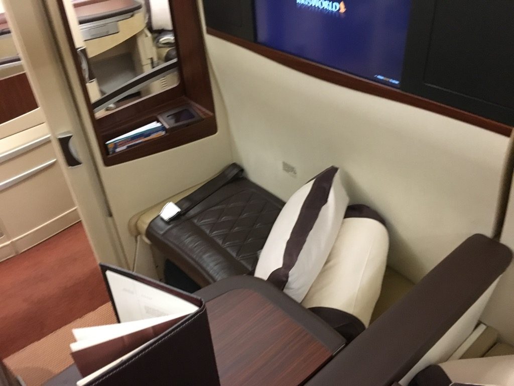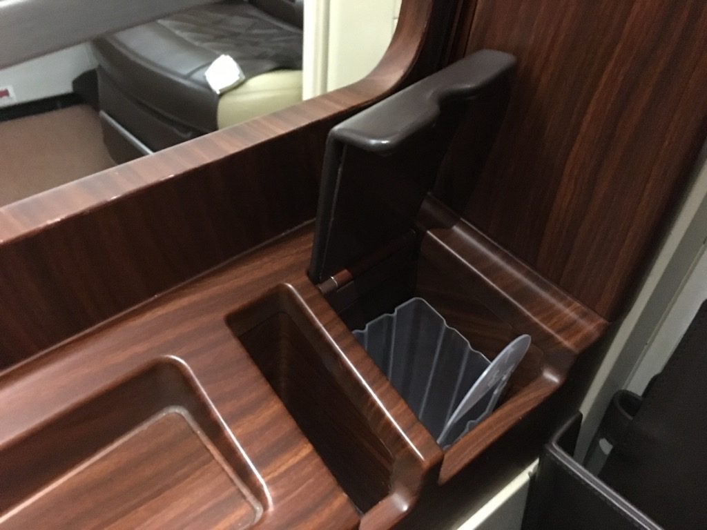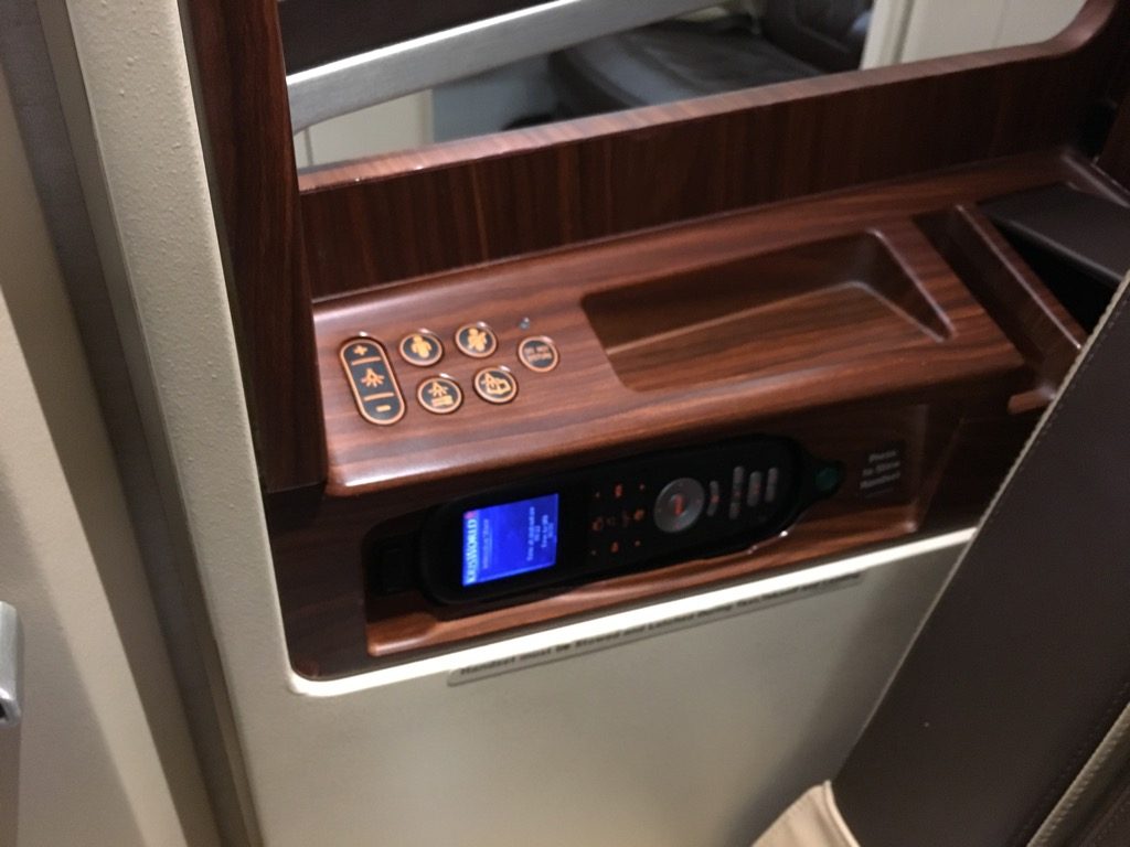 Nicht nur dass der Sitz selbst riesig ist, auch die Ablagefläche neben dem Sitz ist extrem groß. Hier kann man problemlos einen Laptop vollständig abstellen. Es gibt wohl nur wenige Airlines, welche ihren First Class Passagieren so viel eigenen Raum im Flugzeug bieten, wobei man dies mit der neuen Singapore Airlines Suite noch einmal überboten hat.