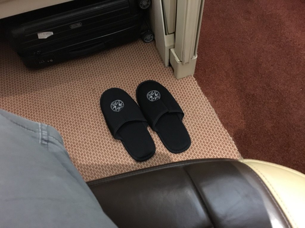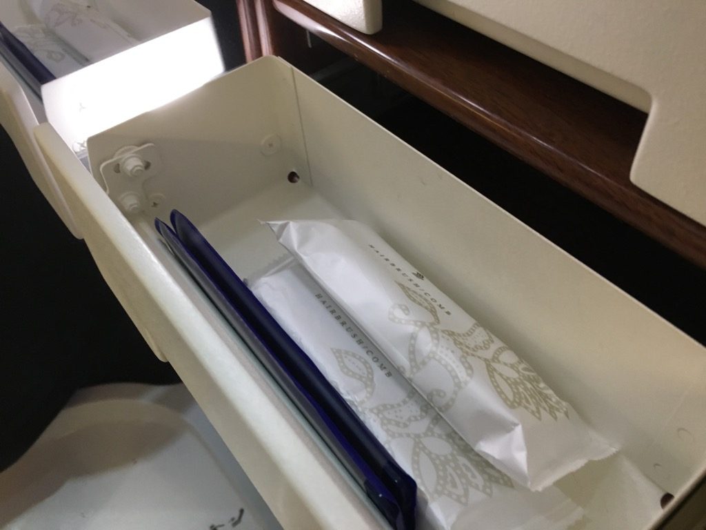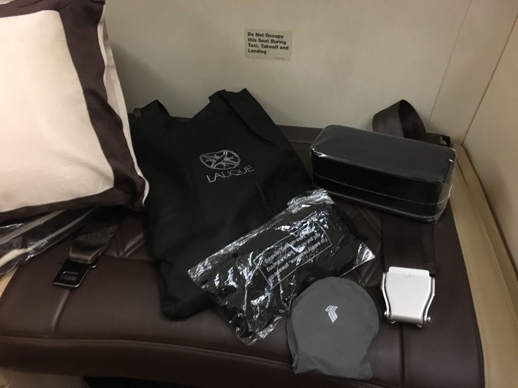 Noch vor dem Start wurde uns das Amenity Kit, ein Pyjama und die Slipper überreicht. Alles war mit Lalique gebrandet, welches eigentlich eine französische Glasmanufaktur ist. Inzwischen scheint man sich allerdings auch im Design zu betätigen. Mir haben die Produkte gefallen.