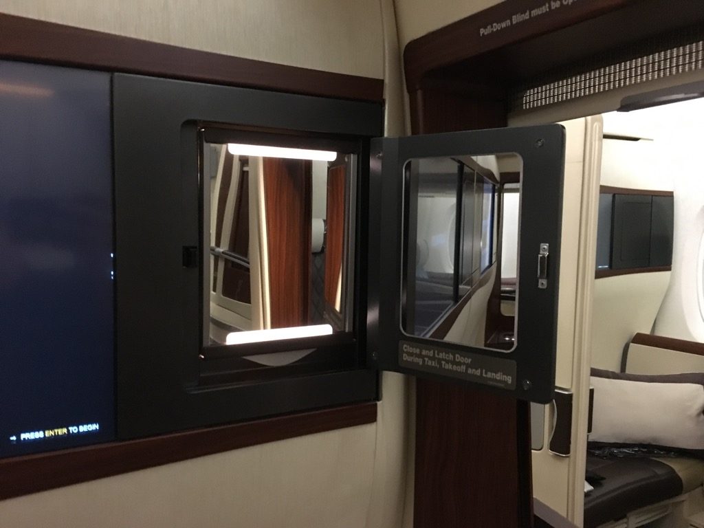 Die Privatsphäre in der Singapore Airlines Suite Class empfand ich übrigens als deutlich besser, als in vielen anderen First Class Suiten, da hier die Türen zum Gang recht hoch waren und man nicht ohne weiteres von oben in die Suite schauen konnte. Auch war das Raumgefühl durch die schiere Größe der Suite war sehr gut und alles andere als eingeengt.