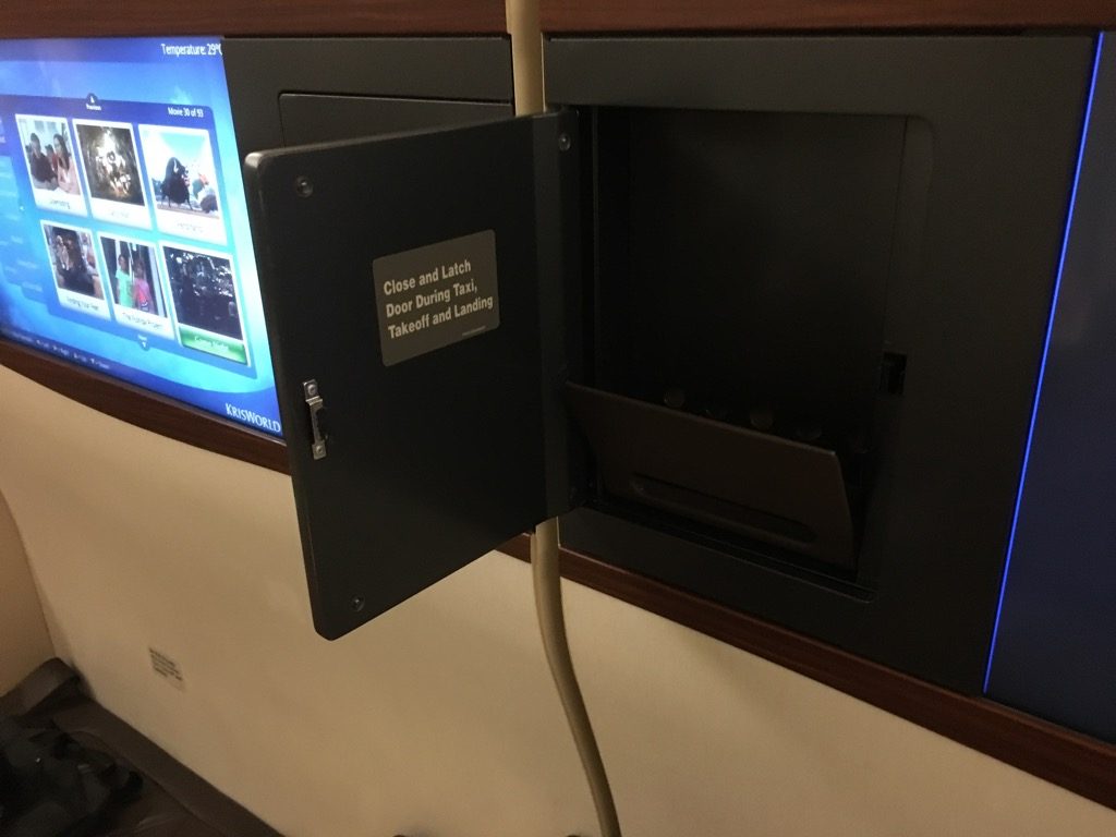 Natürlich hatte der Sitz auch einen großen Monitor, samt des berühmten KrisWorld Entertainment Systems. Hier gibt es eine extrem große Auswahl an Filmen und Serien, sowie Spielen und Audioprogrammen. Da unser Flug ein Nachtflug war, haben wir das Entertainment System allerdings nicht genutzt.