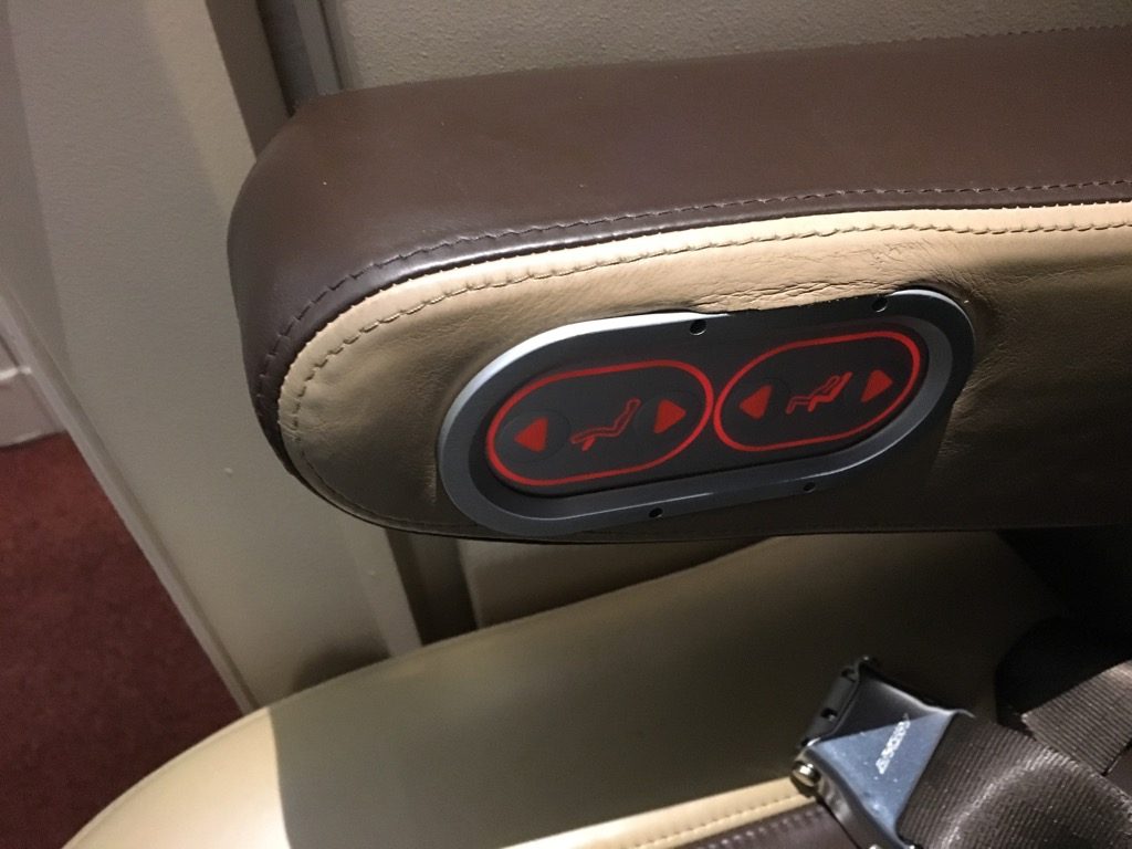 Der Sitz selbst lies sich natürlich auch verstellen. Hierfür fand man in der Armlehne einige Knöpfe zum Verstellen des Sitzes. Einer der größten Kritikpunkte am extrem wuchtigen Singapore Airlines Business Class Sitz ist, dass man diesen nicht besonders weit nach hinten lehnen kann und so kaum eine bequeme Relaxposition finden konnte.