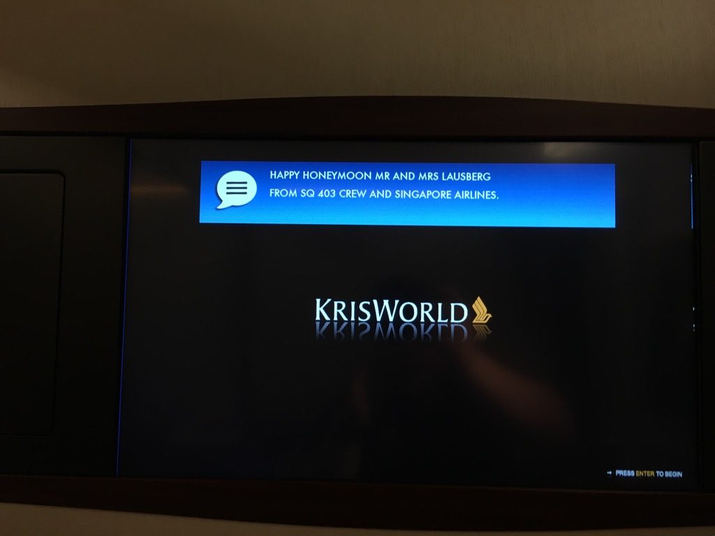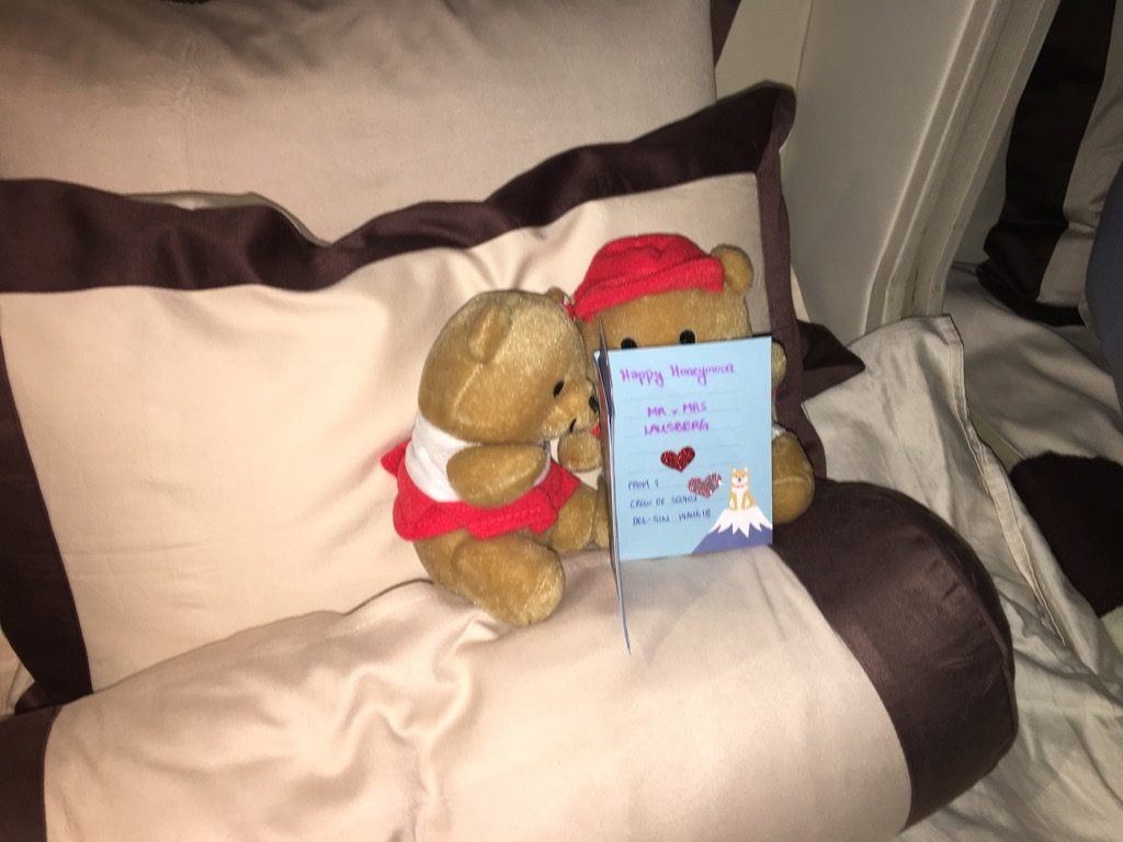 Alle Flugbegleiter waren ehrlich freundlich und auch herzlich, ohne dabei unprofessionell zu sein. Auch persönliche Worte und eine freundliche Unterhaltung waren immer einmal möglich. Richtig süß fand ich zum Beispiel, dass uns einer der Flugbegleiter eine Nachricht auf den Bildschirm geschickt hat um uns zu den Flitterwochen zu gratulieren und auch eine handgeschriebene Karte, samt kleinen Teddybären gab es als Geschenk.