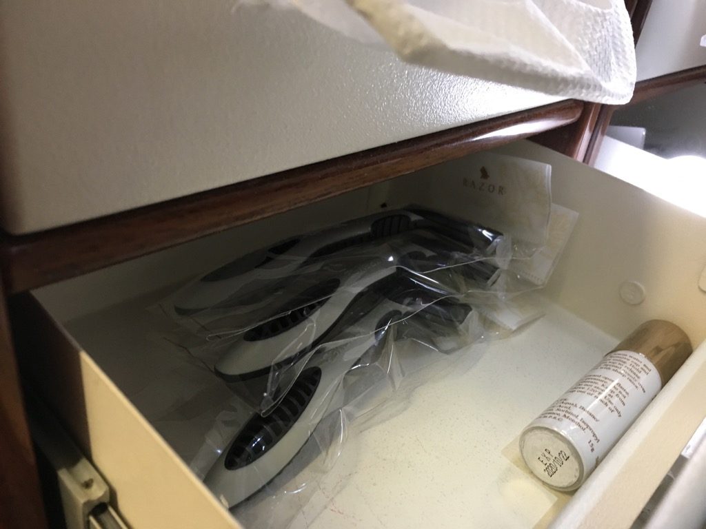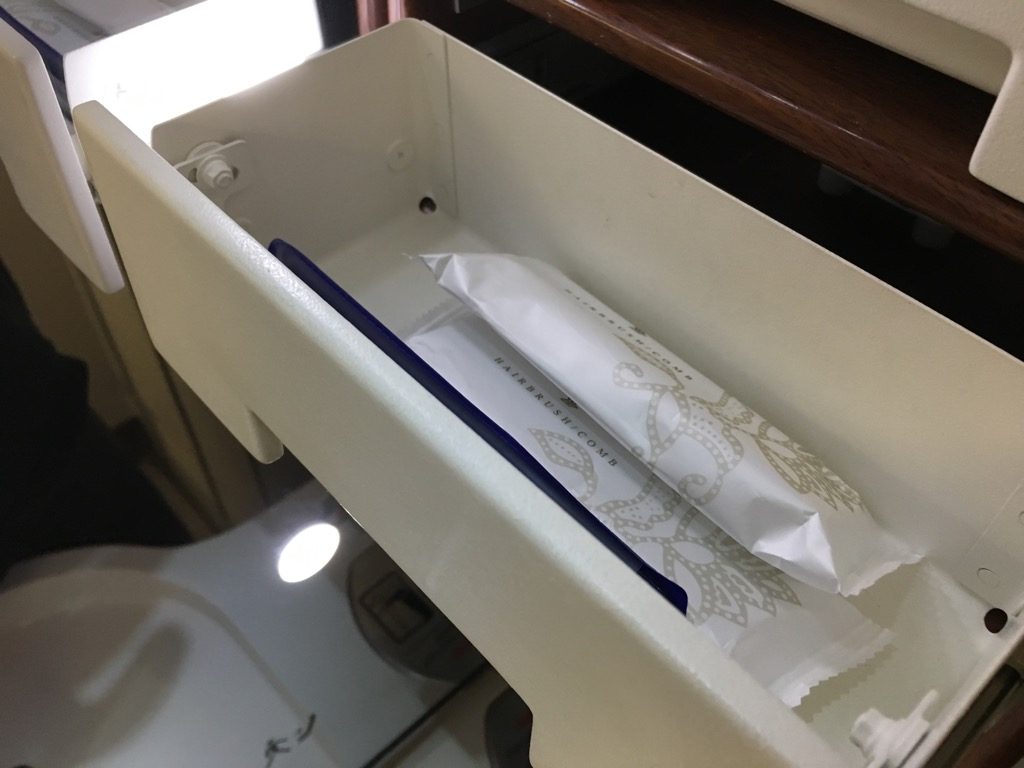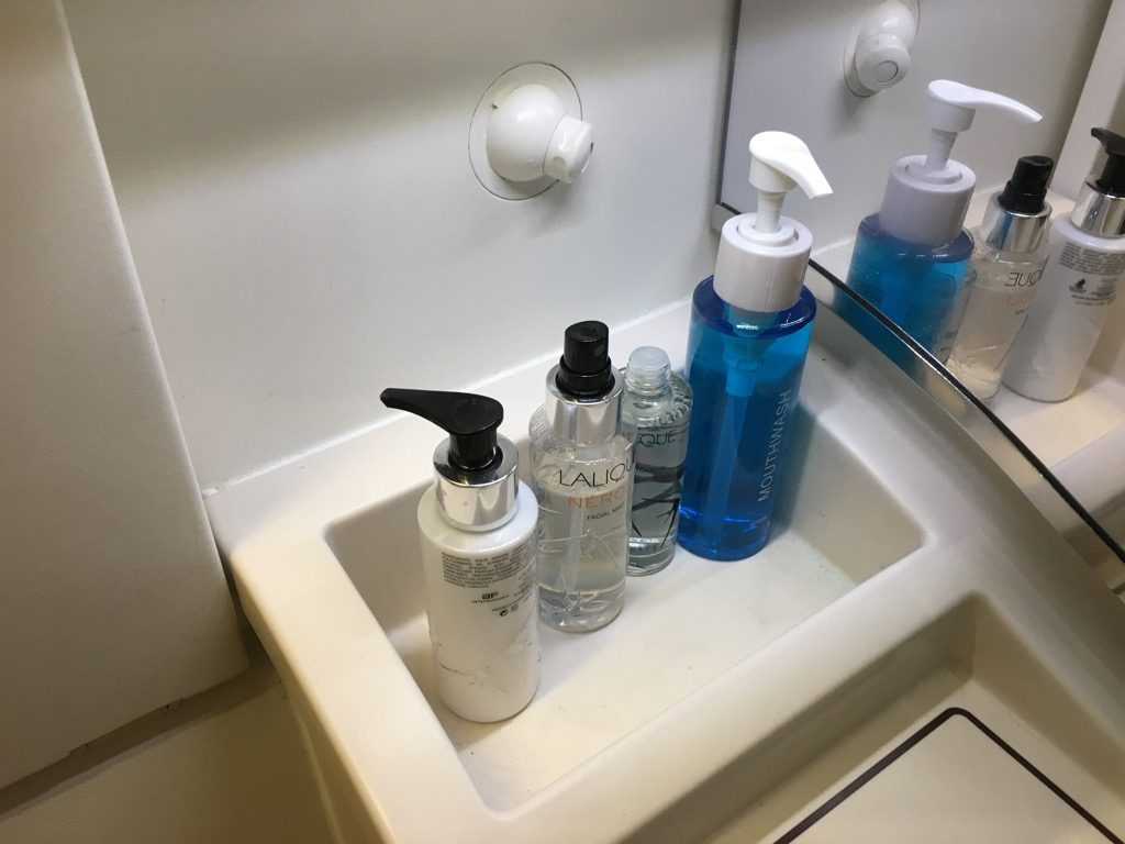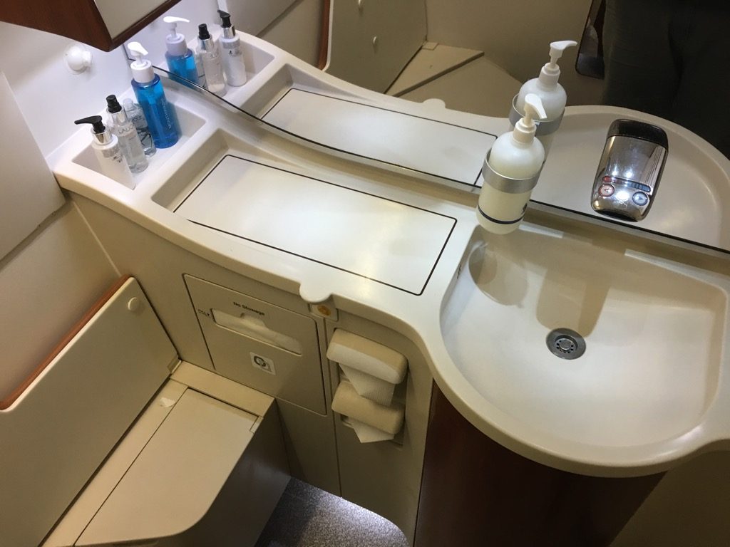 Die Toiletten selbst waren nicht sonderlich spektakulär und nur ein wenig größer als durchschnittliche Flugzeugtoiletten. Sie waren allerdings in einem sehr guten Zustand und mit allerlei Amenities ausgestattet. So fand man hier immer Zahnbürsten, Rasierer, Kämme, Abschminktücher, verschiedene Cremes und Mundspülung.