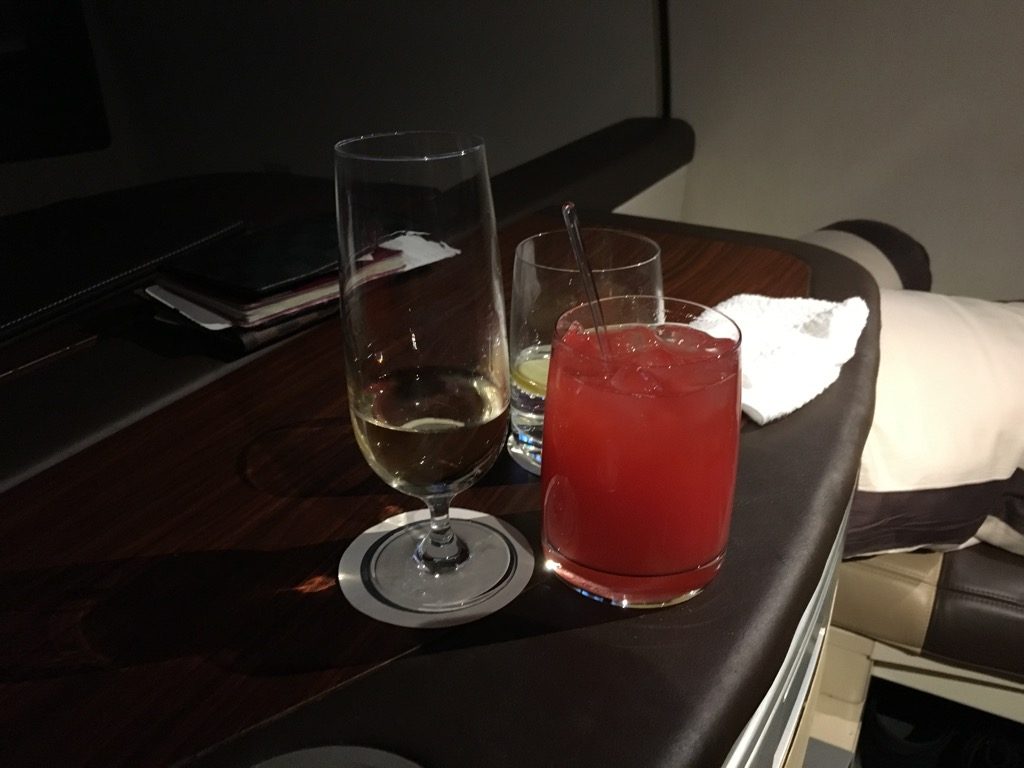 Nachdem wir auf dem Weg nach Singapore waren, habe ich meine Praline mit einem Singapore Sling genossen, während man uns auf dem Sitzpaar vor uns das Bett gemacht hat.