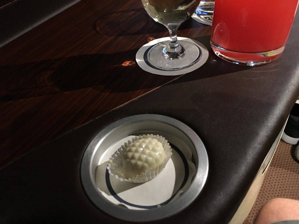 Zum Abschluss des Essens gab es dann noch die Frage nach Kaffee oder Tee und man bot Pralinen an. Irgendwie haben First Class Flugbegleiter weltweit immer einen schlechten Einfluss und wollen die Passagiere motivieren 3-4 Pralinen zu probieren.