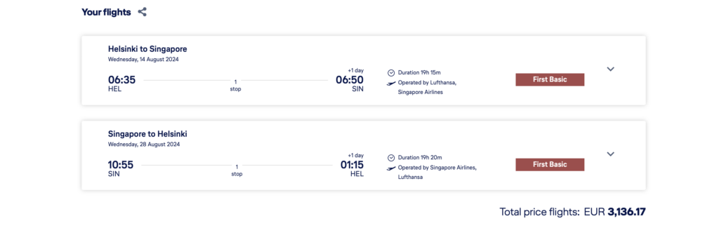Bei dem Tarif ab Helsinki ist es allerdings möglich die Singapore Airlines First Class zu buchen, indem man hier den Lufthansa Code Share Flug auswählt. Diese Flüge sind interessanterweise auch noch etwas günstiger, als wenn man Lufthansa Flüge wählt, wobei der Preisunterschied sehr überschaubar ist. Leider gibt man in der Airbus A380 Suite Class nur wenige Discounter First Class Tickets in der A Klasse für Lufthansa mehr frei, wobei auch die Boeing 777-300er ein unglaubliches Produkt bietet.