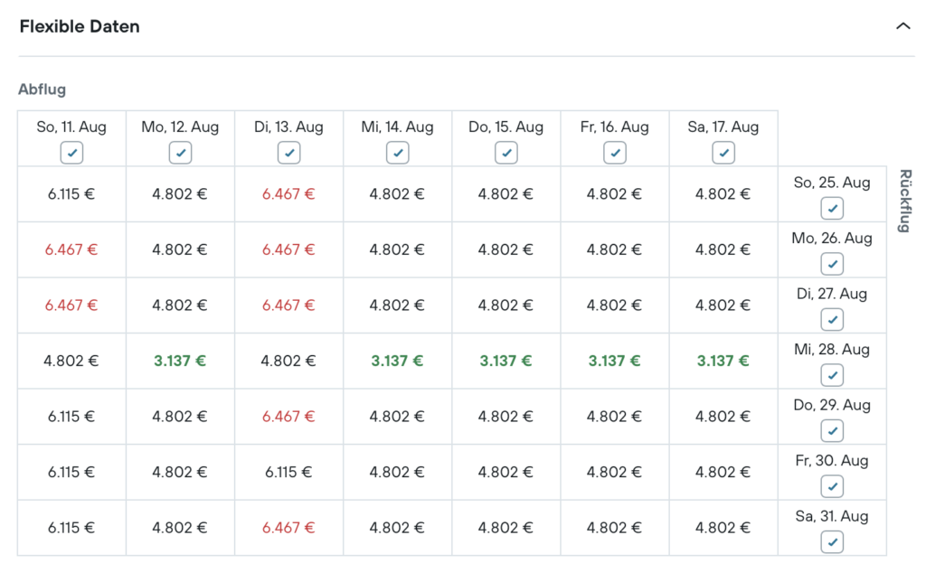Aktuell gibt es nur noch Flüge ab 3900€.