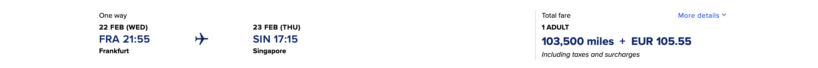 So kostet ein oneway von Frankfurt nach Singapur in der Singapur Airlines Business Class 103.500 KrisFlyer Meilen und auch wenn die Steuern und Gebühren mit etwa 100 Euro bei diesen Flügen recht niedrig sind, man bewegt sich doch absolut im oberen Preissegment bei Prämienflügen und Flüge mit Singapore Airlines sind normalerweise einfach teuer.