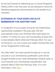 - Der Gold- und Silver-Elite-Status von KrisFlyer wird automatisch um weitere 12 Monate für die nächste Verlängerung der Mitgliedschaft verlängert, die zwischen März 2022 und Februar 2023 fällig ist (der Status von Singapore Airlines basiert nicht auf dem traditionellen Kalenderjahr, sondern alle Mitglieder haben ihre eigene Mitgliedschaft Jahre)