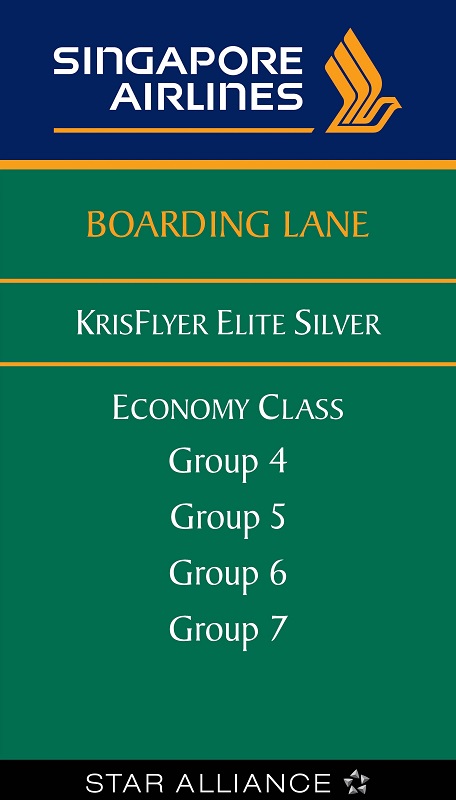 Singapore Airlines hat klassischerweise zwei bzw. drei separate Reihen zum Einsteigen. Die letzte Reihe ist dabei die der Economy Class mit den Boarding Gruppen 4 – 7. Krisflyer Silver Elite Mitglieder müssen auf einem Economy Class-Ticket zwar weiter in der Reihe ihrer Klasse boarden, dürfen dort aber vor allen anderen Gästen einsteigen.