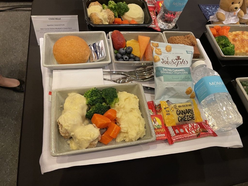 Neben einem hochwertigen Hauptgang (von welchen immer eine westliche und eine asiatische Option zur Auswahl stehen), bekommen die Passagiere auch bei jedem Service eine vollwertige Vorspeise, ein Dessert und frisches Brot serviert. Vor allem das mit Kräuterbutter gefüllte Brötchen ist eine fantastische Idee und lehnt sich an das beliebte Knoblauch Baguette aus der First- und Business Class an.