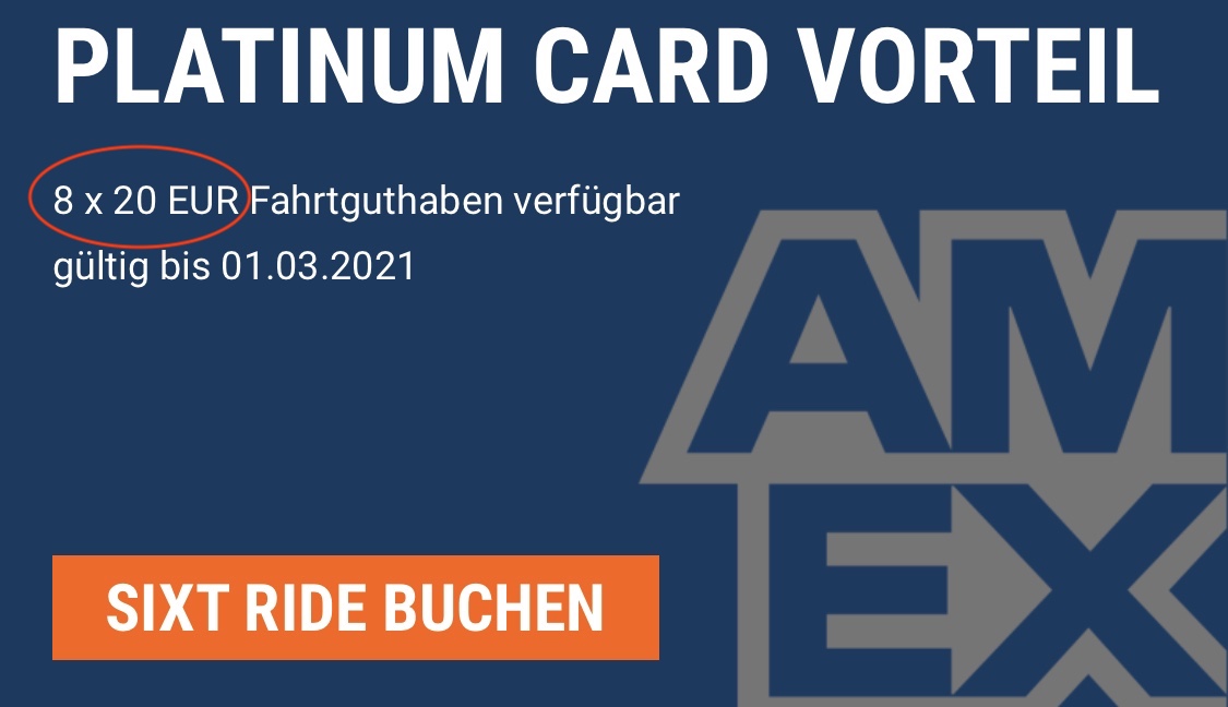 Unglücklicherweise wurden auch (warum auch immer) die Sixt Ride Guthaben der Amex Platinum Mitglieder auf Null gesetzt und der Rabatt wurde bei Fahrten nicht mehr abgezogen, weshalb darüber spekuliert wurde, dass das Sixt Ride Guthaben für die American Express Platinum Karten Inhaber nun Geschichte sei.