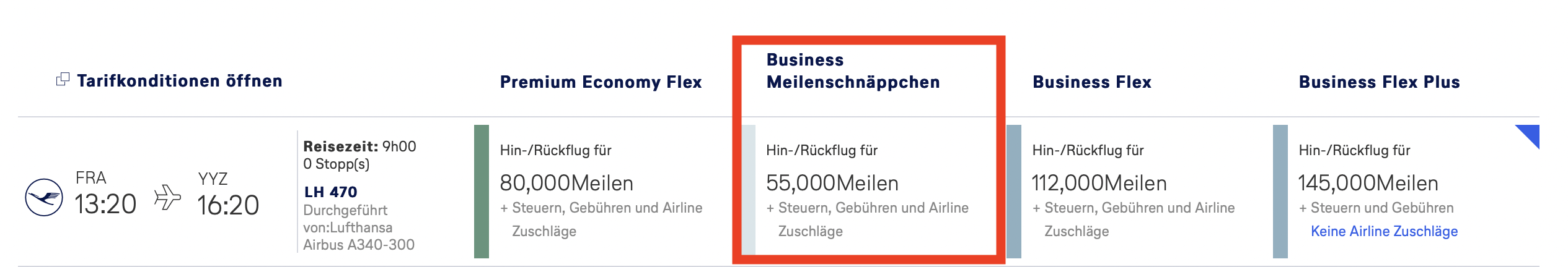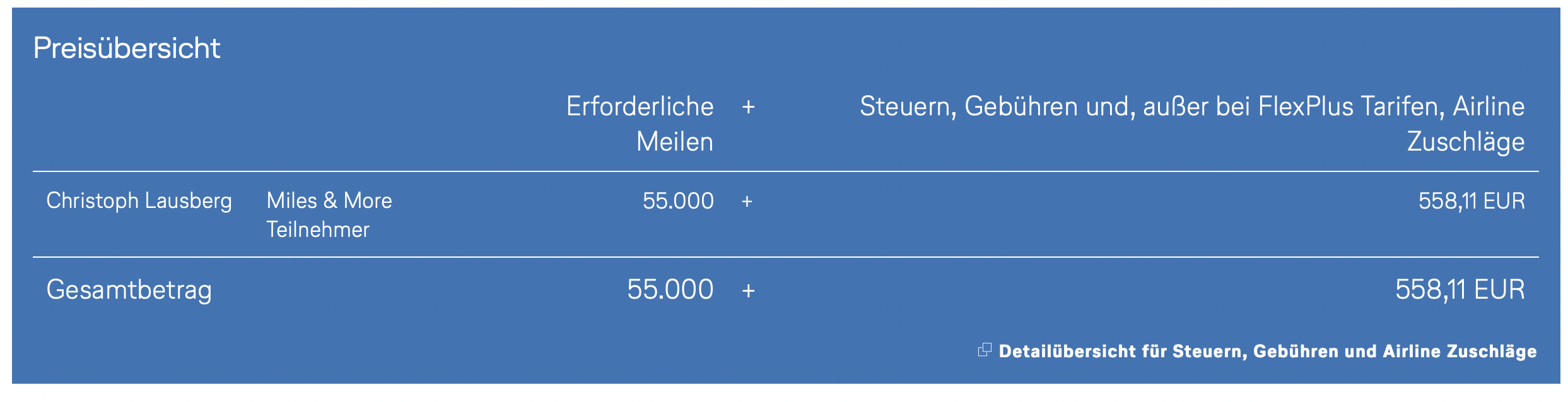 Nur zum Vergleich: Die exakt selben Flüge kosten, wenn man sie einfach direkt auf Lufthansa.com bucht, über 2.500 Euro im günstigsten Tarif. Dabei können die Preise aber auch auf über 6.000 Euro steigen. Der Umweg über die Meilen ist also durchaus attraktiv.