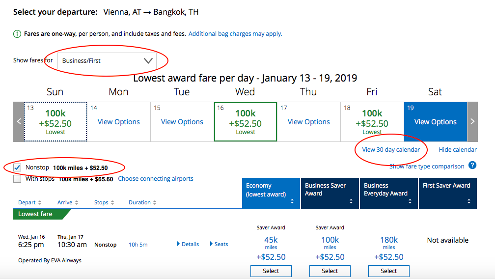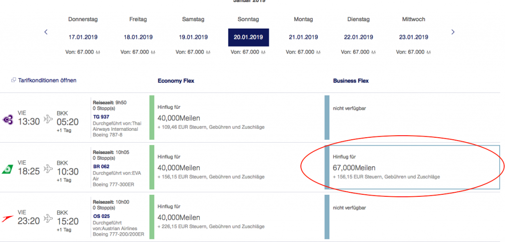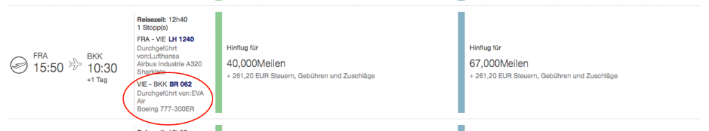 Da es zwischen Wien und Bangkok je einen Direktflug von EVA Air, Thai Airways und einen Direktflug von Austrian Airlines gibt, muss man nur noch überprüfen, ob es ein EVA Flug, ein Thai Airways Flug oder ein Austrian Airlines Flug ist, welcher in der Business Class verfügbar ist.