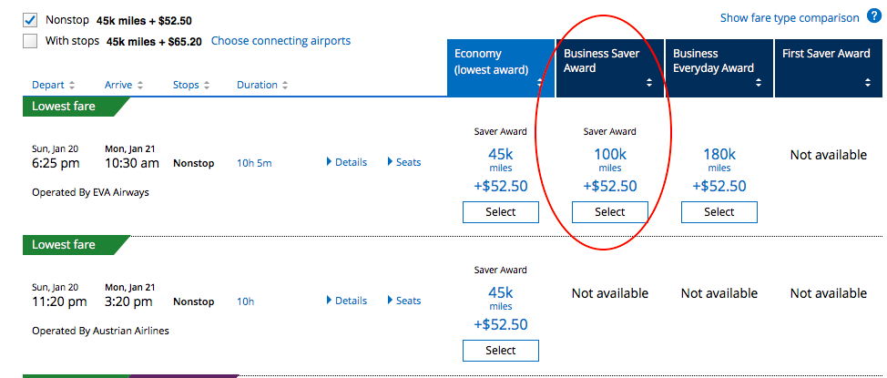In diesem Beispiel wählen wir den 20. Januar aus und hier ist tatsächlich ein Business Class Prämienflug bei EVA Air nach Bangkok verfügbar. Wichtig ist, dass ein „Business Saver Award“ verfügbar ist, in der Buchugsklasse I. Durch einen Klick auf Details, könnt Ihr Euch die Buchungsklasse anzeigen lassen.