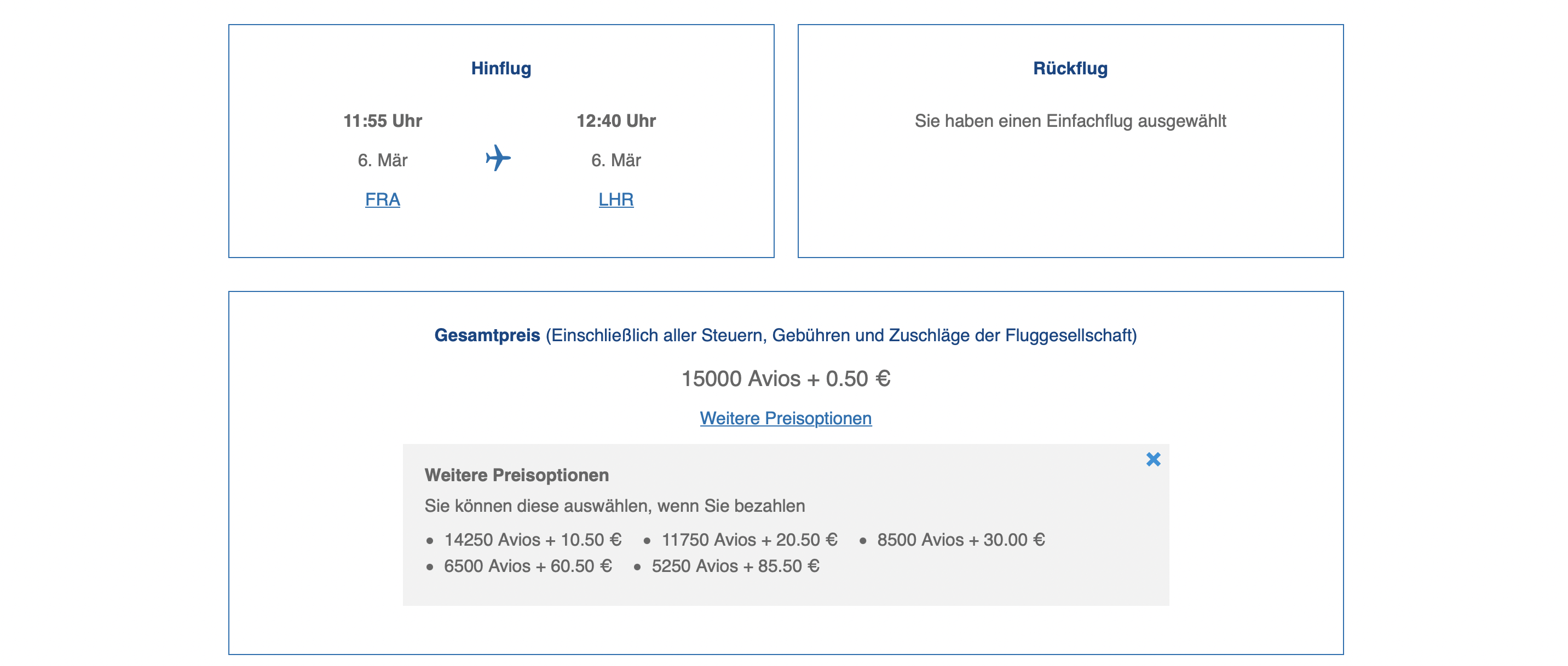Dabei kann man aus verschiedenen Kombinationen an Avios und Geldbeträgen wählen und auch wenn es sich verlockend anhört, nur 50 Cent für seinen Flug in der Business Class zu zahlen, aber der beste Deal entsteht, wenn man die Version mit 8.500 Avios und 30 Euro wählt.