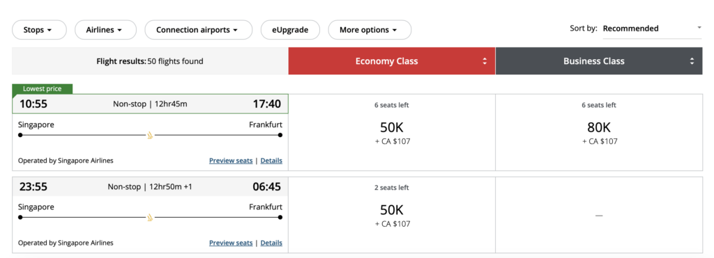 Wer nicht einfach aufs Blaue hinein bei Miles&More anrufen will (was ich auch nicht empfehlen würde) um nach Prämienflügen von Singapore Airlines zu suchen, der kann auch online Verfügbarkeiten suchen. Hierbei empfehle ich immer gerne die Air Canada Webseite, welche Prämeinflüge mit Singapore Airlines aus den Verfügbarkeiten für Partner sehr gut anzeigt, inklusive der Anzahl der verfügbaren Sitze.