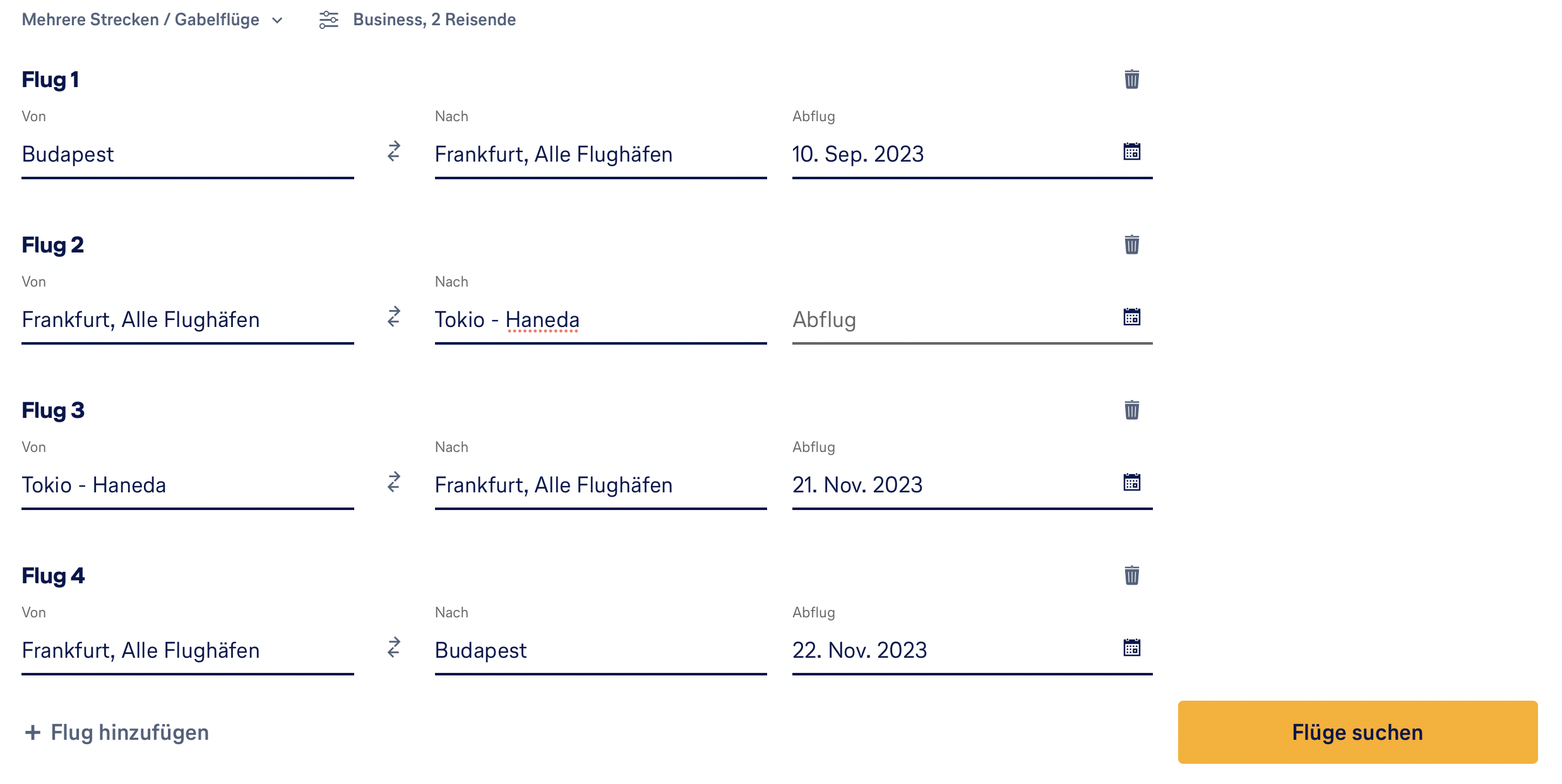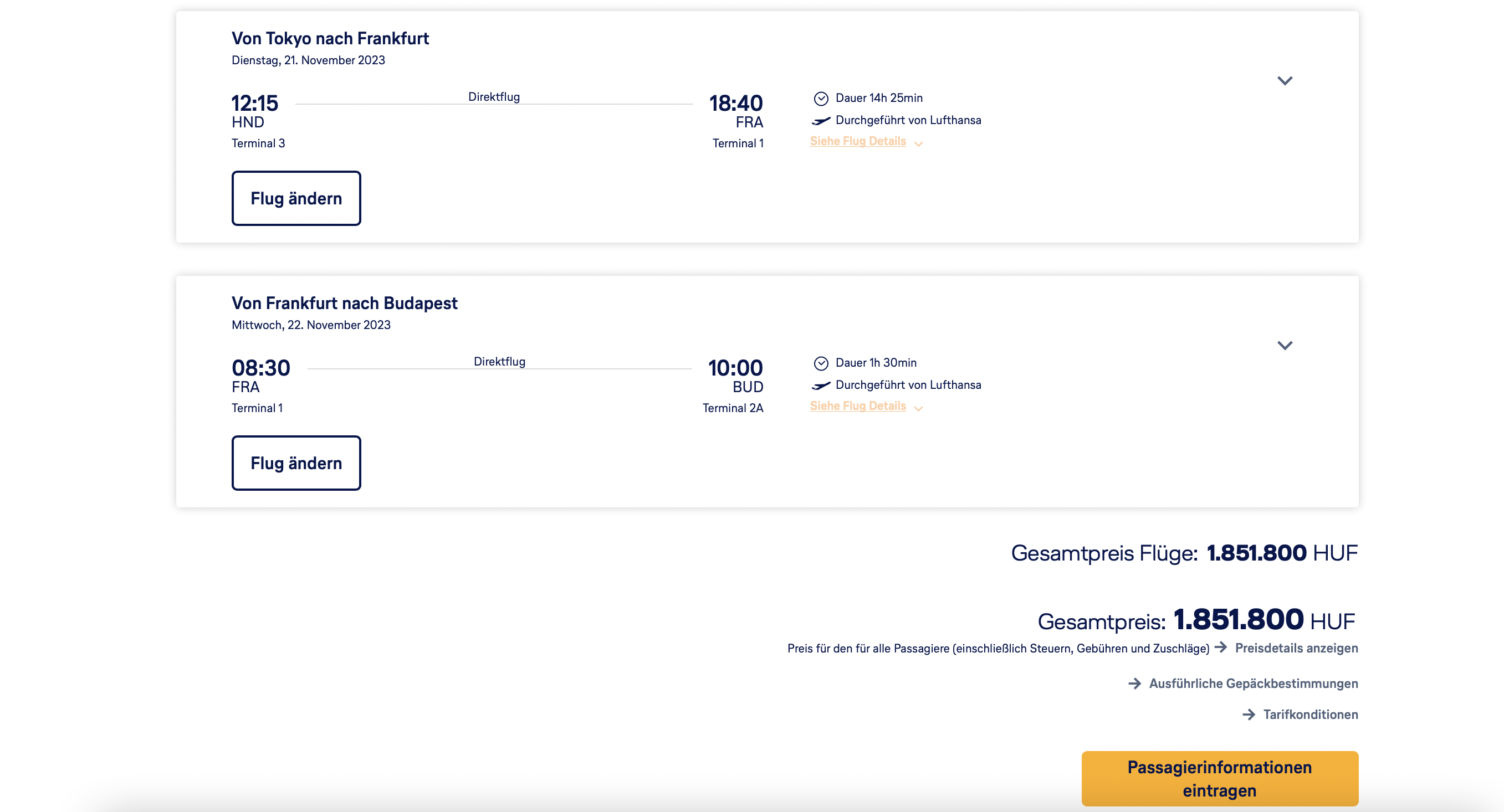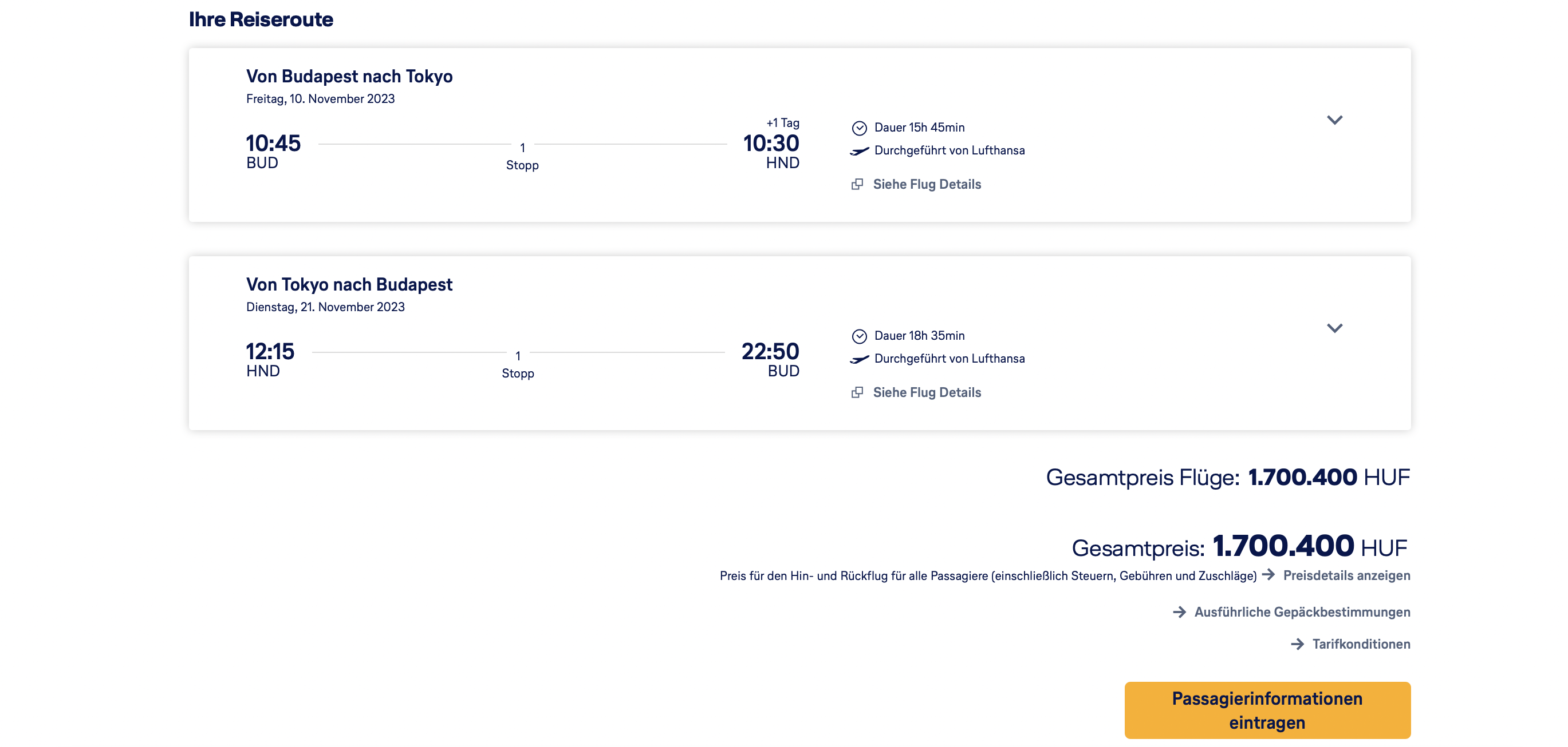 Entsprechend habe ich die Multi Segment Suche auf der Lufthansa Webseite etwas missbraucht und den Flug von Budapest nach Frankfurt zwei Monate vor den Flug von Frankfurt nach Tokio gelegt.