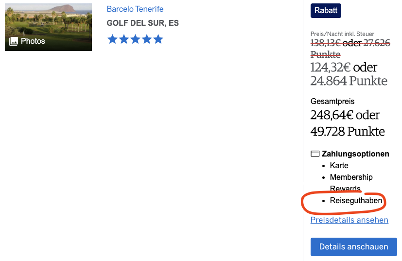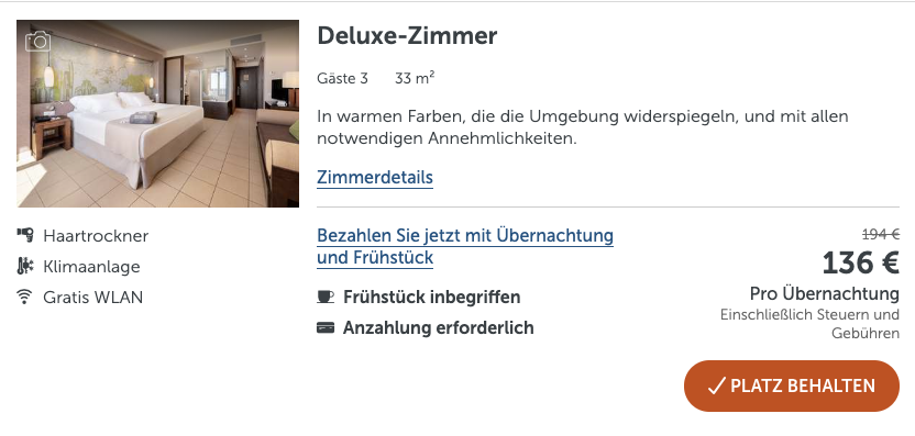 Hier habe ich ein Hotel auf Teneriffa für den Oktober 2021 herausgesucht. Im Amex Reiseportal ist das Barcelo sogar noch etwas günstiger als direkt beim Anbieter. Das fünf-Sterne Hotel kostet für zwei Nächte 248,64€ und 272€ auf der Barcelo Homepage.